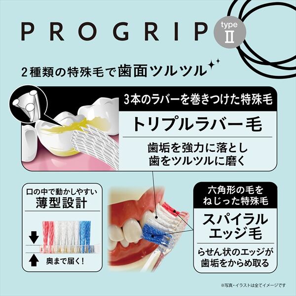 ブラシの中央部に3本のラバーを巻き付けた特殊毛「トリプルラバー毛」を採用し、先端と後端には六角形の毛をねじった特殊毛「スパイラルエッジ毛」を採用。