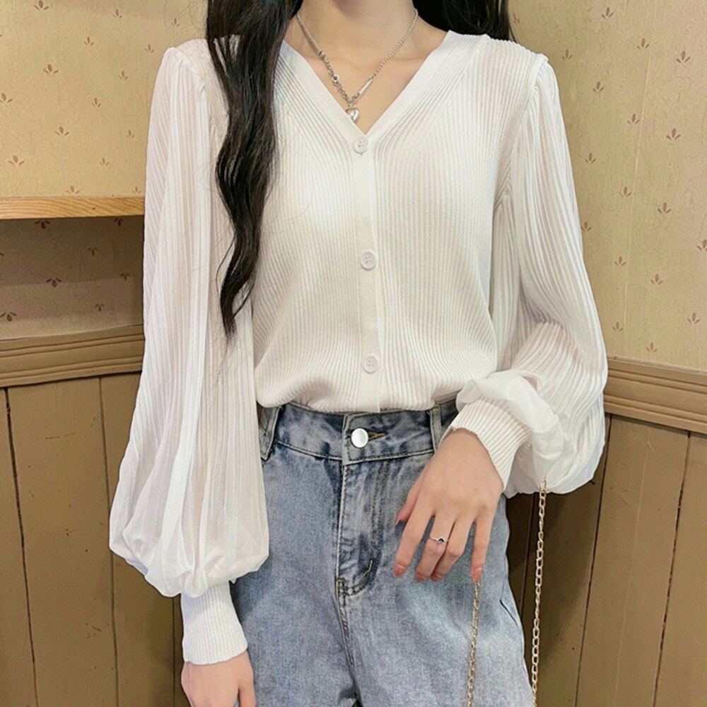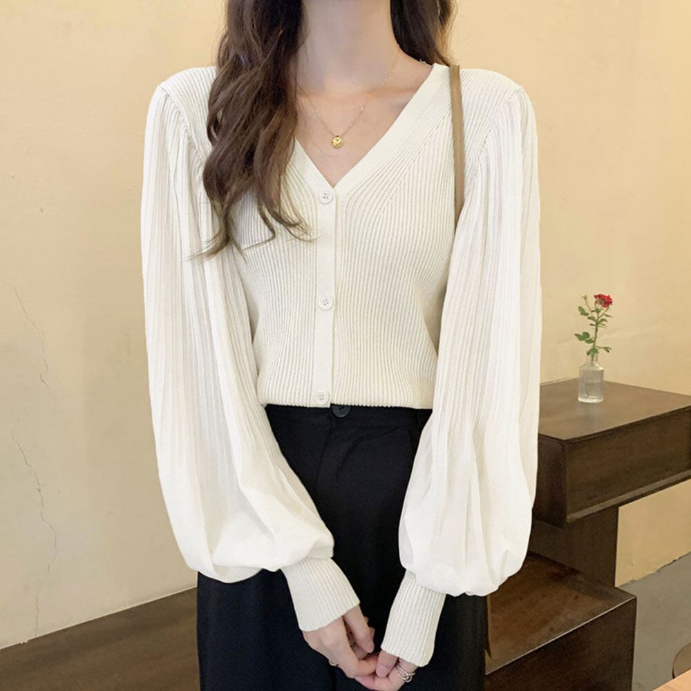 レディース ニットブラウス 異素材 切り替え トップス ランタンスリーブ 羽織 前開き 無地 こなれ感 ブラウス 通学韓国風 カジュアル 大人 春秋コーデ 長袖ゆったり着やせ落ち感のある大人可愛さを演出する前開きランタンスリーブニットカーディガン。