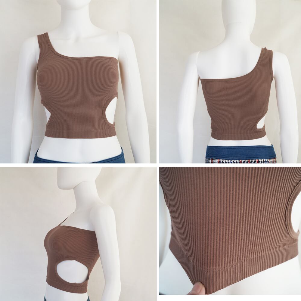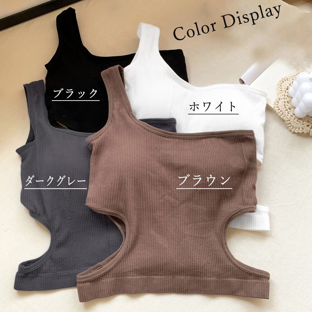 カップ付きトップス ノンワイヤー セクシー サマーニット レイヤード インナー 肌見せ リブニットショート丈トップス 韓国ファッション フィット感 重ね着ヘルシーな印象のワンショルダーリブタンクトップカップ付きなので1枚で着るのはもちろん、インナーとしても着まわせるメインにも、インナーにも使いやすい素材感でトレンドのシアートップスとのコーディネートもおすすめ素材:ポリエステル85%+ポリウレタン15%カラー:ホワイト/ブラック/ダークグレー/ブラウンサイズ:ワンサイズ着丈:約40cmトップバスト:約60-80cmアンダーバスト:約58-78cmワイヤー:なしカップ:あり(取り外し不可) 裏地:カップ部分のみあり伸縮性:あり透け感:ホワイトのみややあり※ニット素材の為、伸縮具合によっては編みに隙間を感じる場合があります。