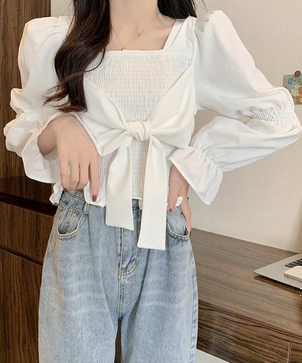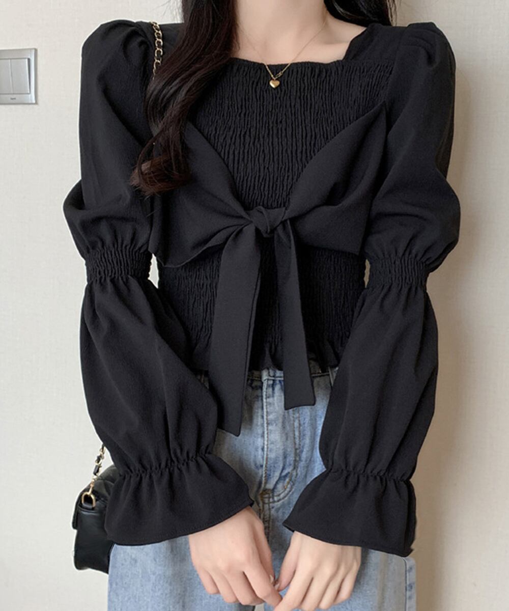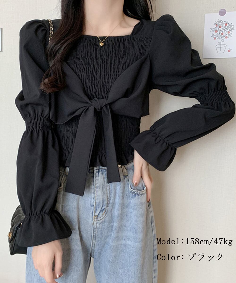 レディーストップス スクエアネック ギャザーブラウス プルオーバー フロントリボン 鎖骨見せ フェミニン 韓国風おしゃれ大人可愛い 着やせ パフスリーブ袖 春夏トップス 長袖スクエアネックがデコルテを綺麗に魅せてくれるトレンドブラウスフロントに添えたリボンが程よい愛らしさをプラス脚長を狙ってハイウエストのボトムスと合わせると、スタイルもお洒落さもアップ素材:ポリエステル100%カラー:ホワイト/ブラックサイズ:ワンサイズ着丈:約42cm 肩幅:約34cm 袖丈:約61cm ゆき:約78cm 身幅:約30cm 胸囲:約60-72cm裏地:なし伸縮性:シャーリング部分のみあり透け感:ホワイトのみややあり生産国:中国※すべて平置きサイズです(採寸方法違いより、多少の誤差がございますので、ご了承ください)。