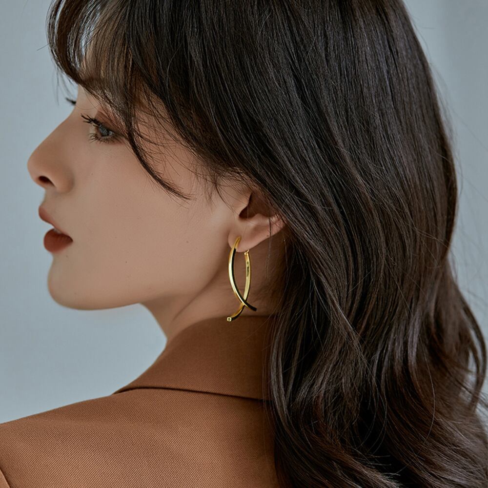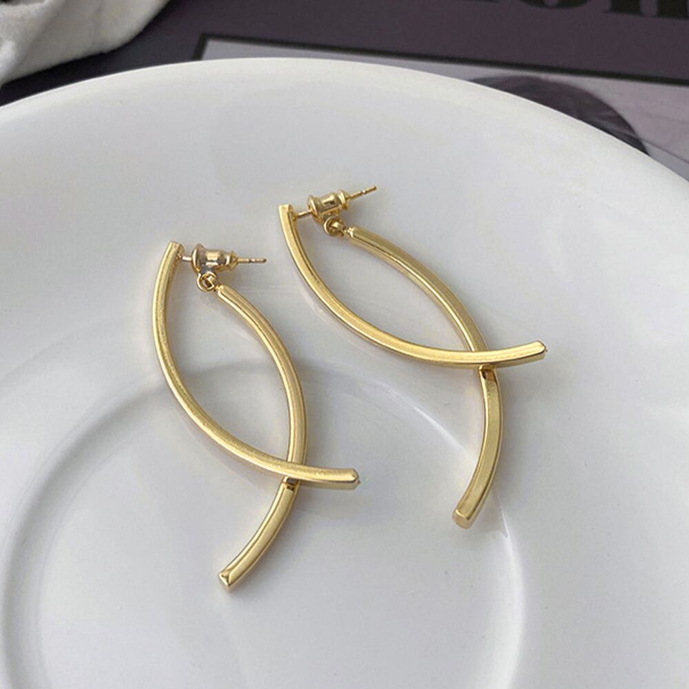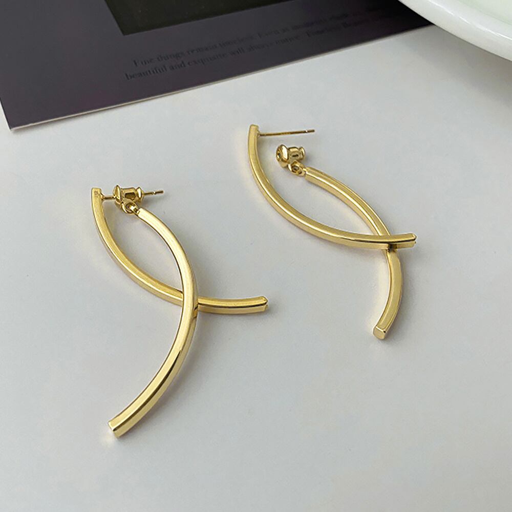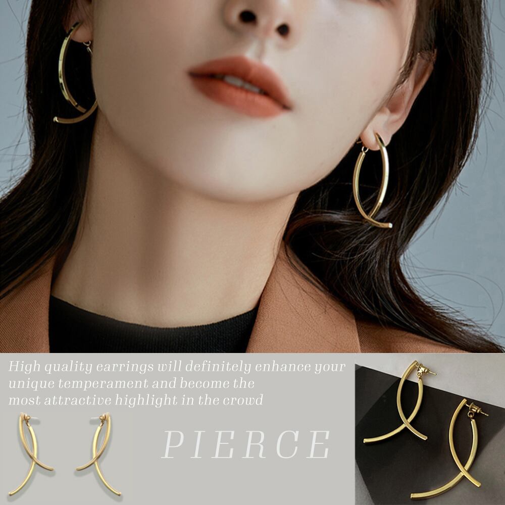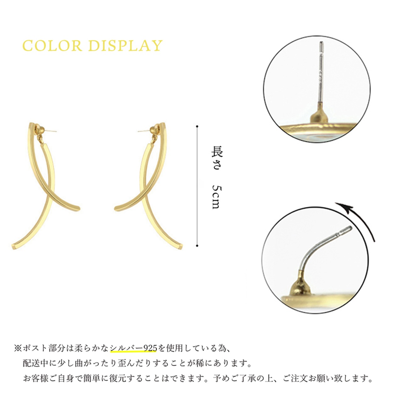 シンプルさを極めるクロスラインピアス華奢な美しい曲線に女性らしさを感じられるカジュアルからフォーマルまで幅広く使える素材:合金カラー:ゴールド長さ:約5cm生産国:中国※ポスト部分は柔らかなシルバー925を使用している為、配送中に少し曲がったり歪んだりすることが稀にあります。