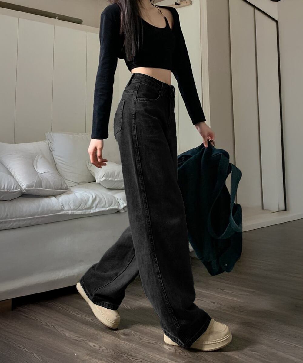 レトロ風ジーンズ ハイウエスト ウォッシュデニム 美脚脚長 セミワイドパンツ フルレングス 着やせジーパン 体型カバー