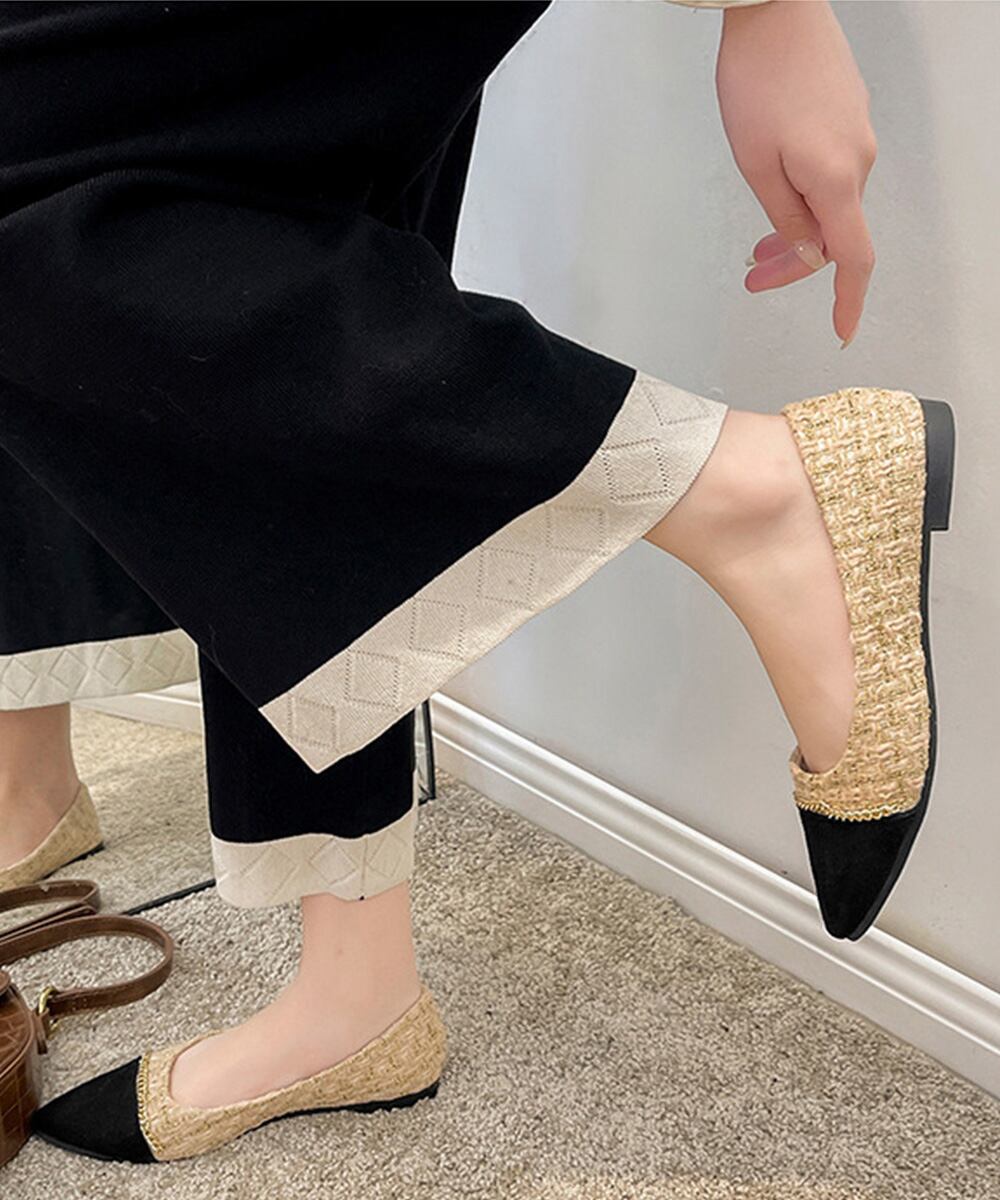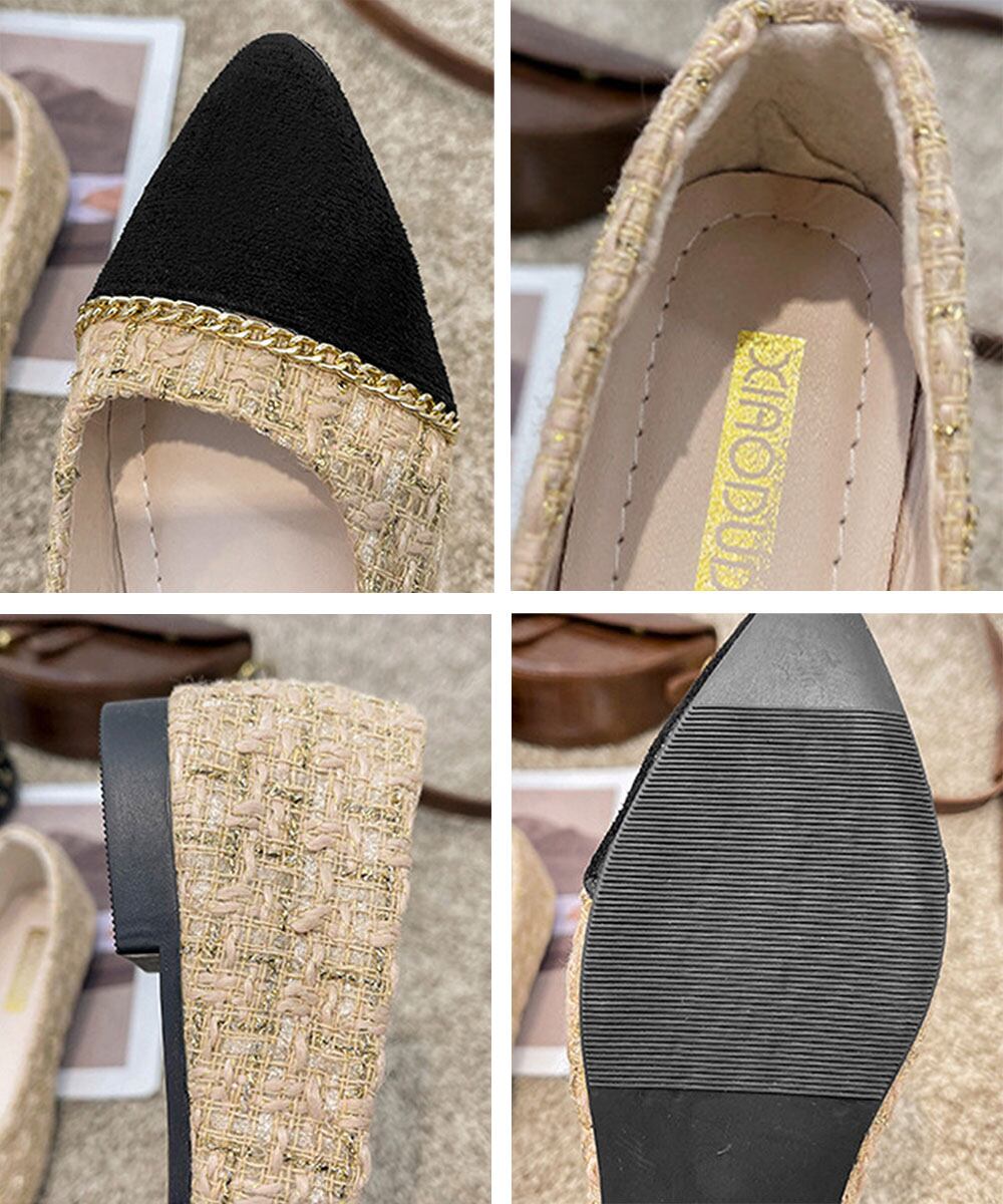 ポインテッドトゥパンプス ローヒール 痛くないぺたんこパンプス 歩きやすい 走れる配色パンプス 脱げない プチプラ婦人靴美脚シューズ異素材 お洒落パンプス大人 通勤通学疲れない靴スエード生地とツイード風生地に合金チェーン、上品でお洒落な異素材mixパンプス足を優しく包み込み締め付けず、軽量仕様だから長く履いても疲れない楽ちんシューズ落ち着きのある大人っぽい色合いはコーデに馴染みやすく、普段使いでも、入学式や入園式、同窓会やお食事会など、ちょっとしたイベントシーンでも使える甲素材:合成繊維底素材:合成底カラー:ブラック/ベージュサイズ:22.5cm(35)/23.0cm(36)/23.5cm(37)/24.0cm(38)/24.5cm(39)/25.0cm(40)(カッコ内は靴底表記となります)[22.5]長さ:約22.5cm 幅:約7.3cm ヒール:約1.2cm[23.0]長さ:約23.0cm 幅:約7.4cm ヒール:約1.2cm[23.5]長さ:約23.5cm 幅:約7.5cm ヒール:約1.2cm[24.0]長さ:約24.0cm 幅:約7.6cm ヒール:約1.2cm[24.5]長さ:約24.5cm 幅:約7.7cm ヒール:約1.2cm[25.0]長さ:約25.0cm 幅:約7.8cm ヒール:約1.2cm重さ(両足):約214g-247g生産国:中国※すべて平置きサイズです(採寸方法違いより、多少の誤差がございますので、ご了承ください)。
