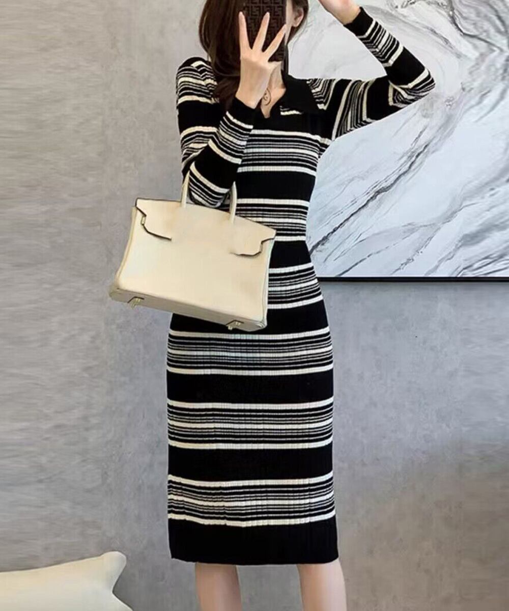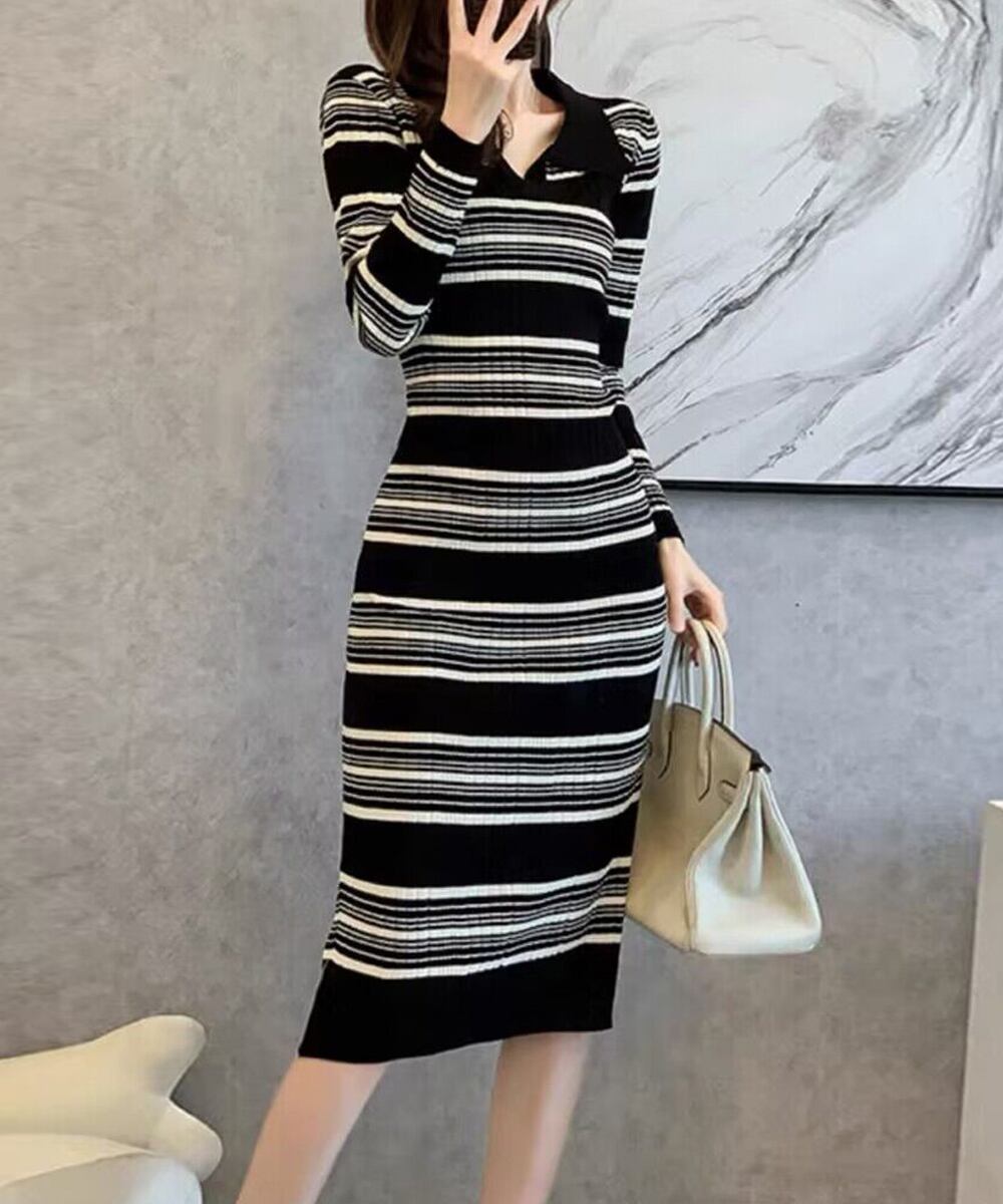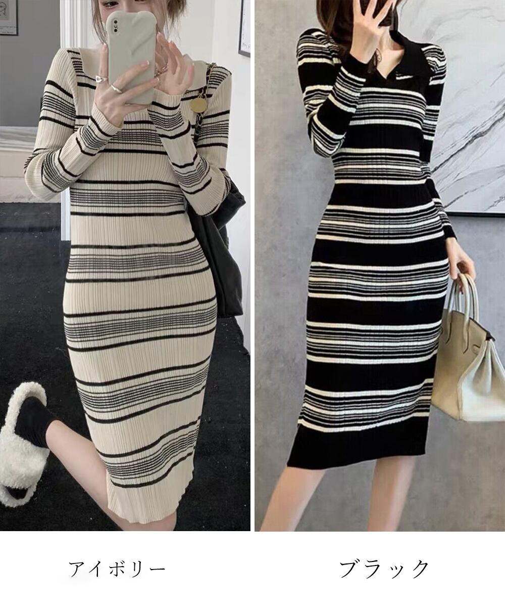 レディース 襟付き タイトワンピース 長袖 カジュアルワンピース 着やせ リブニットワンピ 通勤 通学 きれいめ ワンピ細見え ワンピース ポロシャツワンピ秋 着回しワンピース春トレンドのポロデザインとボーダー柄がカジュアルコーデにぴったりなワンピースタイトなシルエットが女性らしさを引き立て、スリムなシルエットを演出する1枚で着るのはもちろん、ジャケットや羽織りを合わせてオシャレなアイテム素材:ポリエステル65%+綿35%カラー:ブラック/アイボリーサイズ:ワンサイズ着丈:約94cm 肩幅:約30cm 袖丈:約57cm ゆき:約72cm 身幅:約32cm 胸囲:約64-140cm ウエスト:56-135cm ヒップ:58-140cm裏地:なし伸縮性:あり透け感:なし生産国:中国※すべて平置きサイズです(採寸方法違いより、多少の誤差がございますので、ご了承ください)。