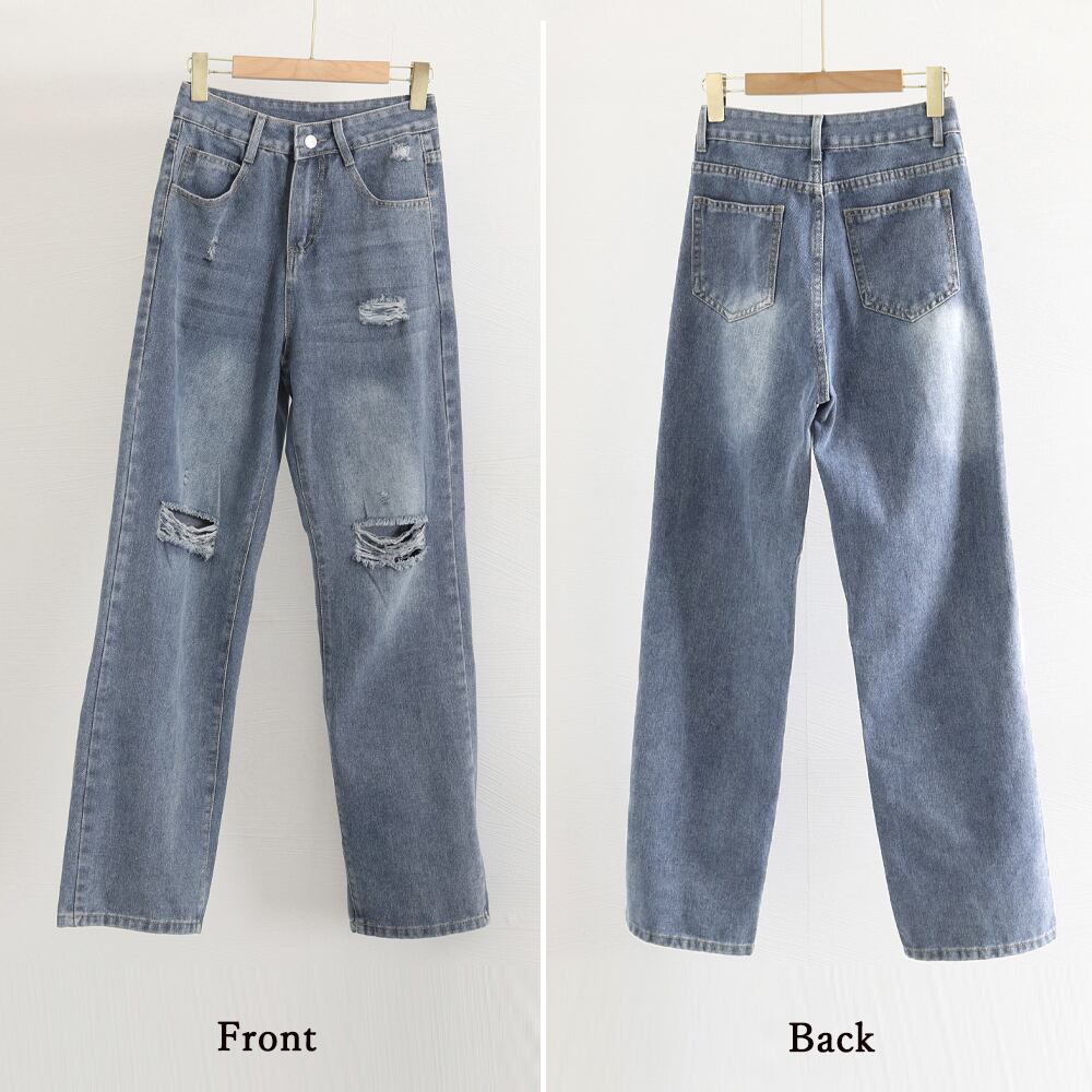 韓国ファッション ダメージジーンズ 体型カバー ウォッシュジーンズ ストレートデニムパンツ 美脚脚長パンツ ロングパンツストリートジーパン ハイウエストデニム カジュアルボトムス穿くだけでこなれた大人カジュアルが確立、ダメージ加工のヴィンテージ感溢れるハイウエストデニムパンツストンとしたストレートシルエットは脚のラインを拾わず、縦ラインを強調して美脚脚長魅せするスマートなロング丈ジーパン1枚でサマになる主役級アイテムなので、シンプルなトップスと合わせても洗練されたラフ感&抜け感コーデが完成素材:綿82.6%+ポリエステル17.4%カラー:ブルーサイズ:S/M/L/XL[S]着丈:約106cm 股下:約76cm ウエスト:約62cm ヒップ:約92cm もも周り:約56cm[M]着丈:約106cm 股下:約76cm ウエスト:約66cm ヒップ:約96cm もも周り:約58cm[L]着丈:約106cm 股下:約76cm ウエスト:約70cm ヒップ:約100cm もも周り:約60cm[XL]着丈:約106cm 股下:約76cm ウエスト:約78cm ヒップ:約104cm もも周り:約62cm裏地:なし伸縮性:なし透け感:なし生産国:中国※すべて平置きサイズです(採寸方法違いより、多少の誤差がございますので、ご了承ください)。