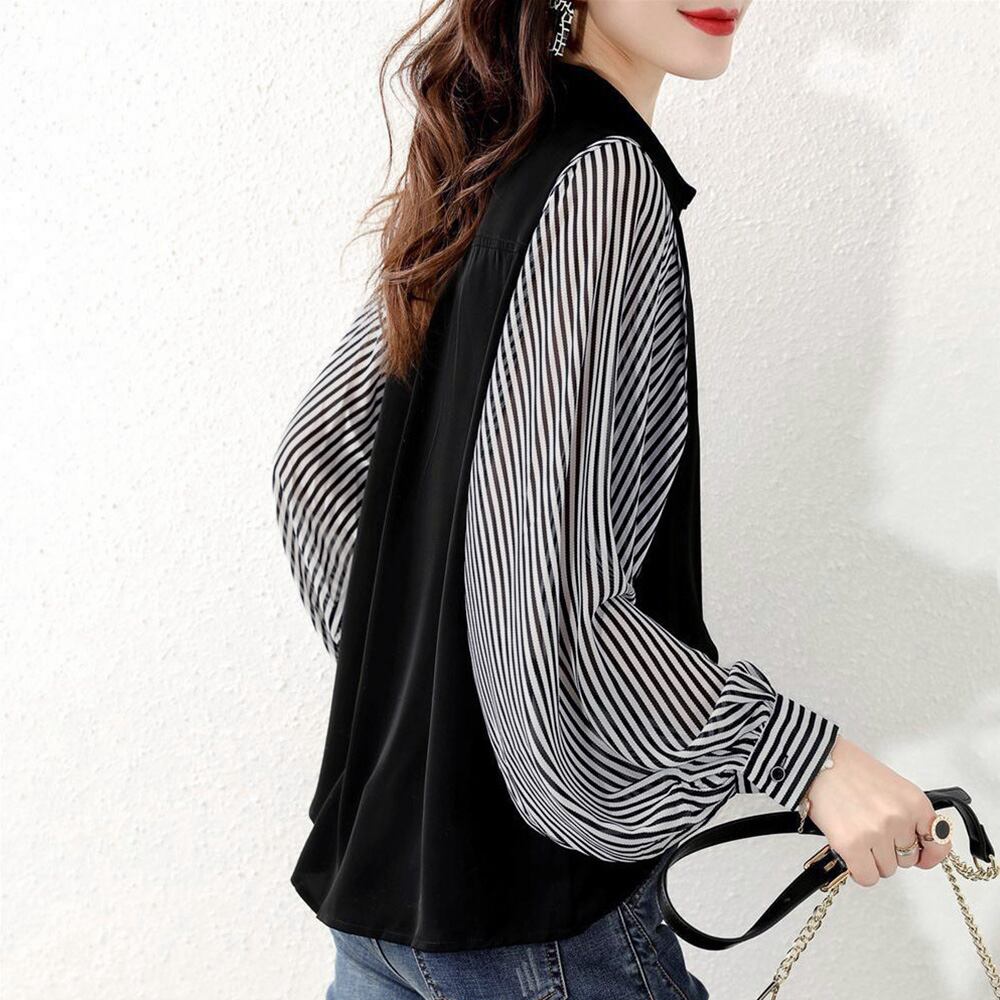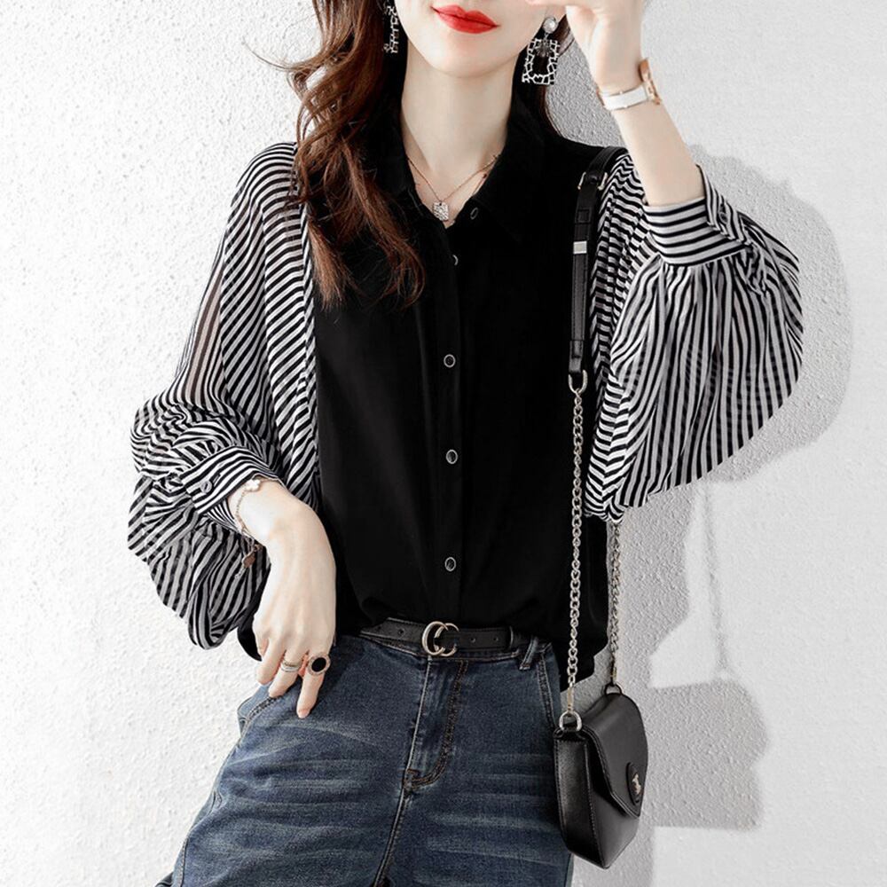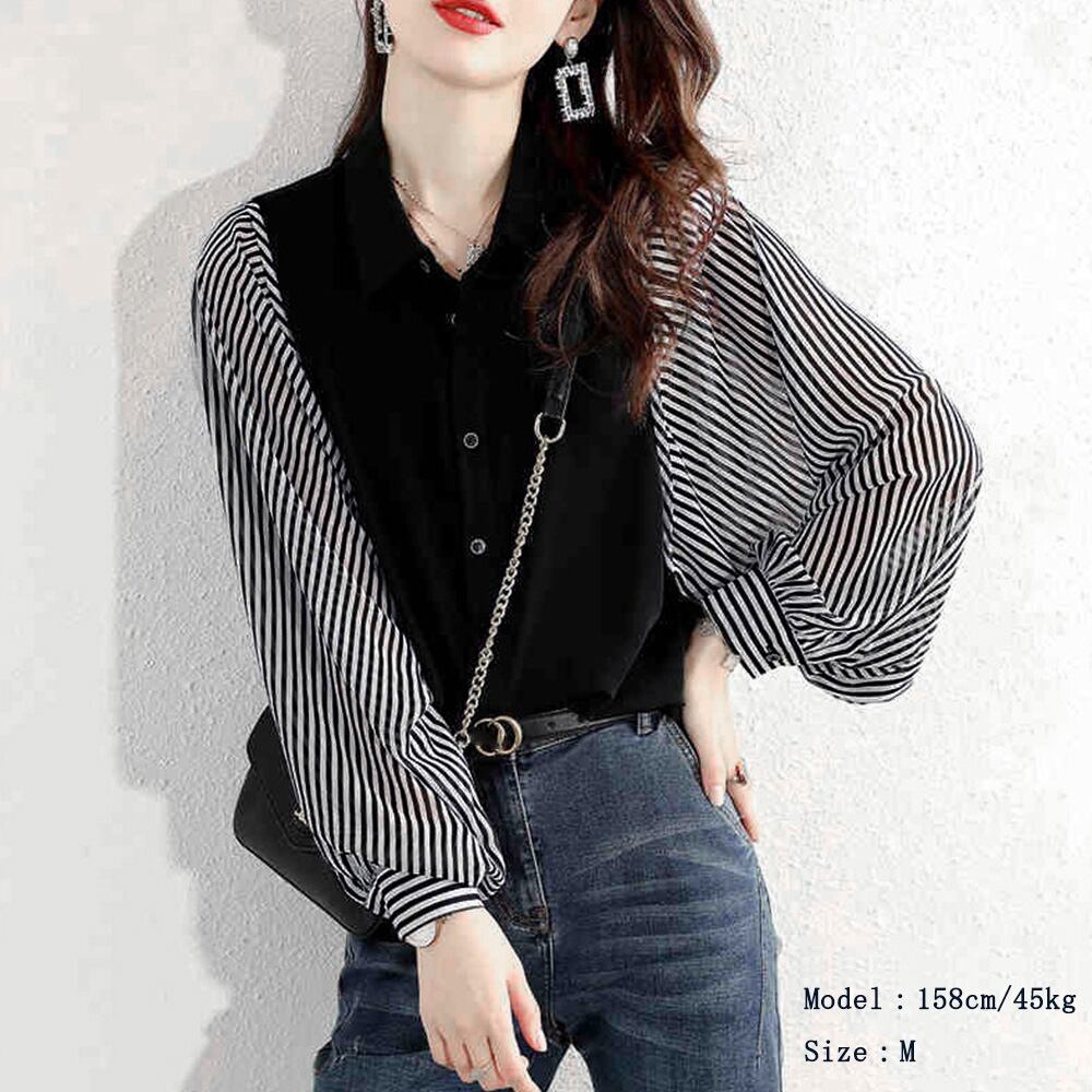 ゆったり ストライプ柄 ブラウス 袖切り替え オフィスカジュアル トップス 大人女性 おしゃれ ブラウス着やせ 通勤大人韓国ファッション ブラウス体型カバー オフィス ブラウス大人女性にふさわしい品格とおしゃれを兼ね備えた長袖ブラウスストライプ柄のランタンスリーブがアクセントとなり、腕周りを華奢に見せるオフィスカジュアルだけでなく、デートやカフェでのカジュアルなシーンにもピッタリ素材:ポリエステル100%カラー:ブラックサイズ:M/L/XL/XXL[M]着丈:前丈約64cm/後ろ丈約68cm 肩幅:約34cm 袖丈:約57cm ゆき:約74cm 身幅:約52cm 胸囲:約104cm[L]着丈:前丈約65cm/後ろ丈約69cm 肩幅:約35cm 袖丈:約58cm ゆき:約75.5cm 身幅:約54cm 胸囲:約108cm[XL]着丈:前丈約65cm/後ろ丈約70cm 肩幅:約36cm 袖丈:約59cm ゆき:約77cm 身幅:約56cm 胸囲:約112cm[XXL]着丈:前丈約66cm/後ろ丈約71cm 肩幅:約37cm 袖丈:約60cm ゆき:約78.5cm 身幅:約58cm 胸囲:約116cm裏地:なし伸縮性:なし透け感:袖のみややあり生産国:中国※すべて平置きサイズです(採寸方法違いより、多少の誤差がございますので、ご了承ください)。