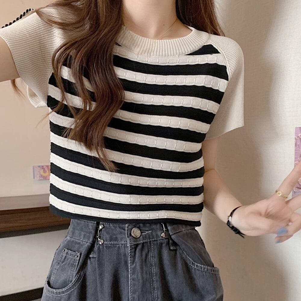 大人カジュアル レディース ニットTシャツ ラグランスリーブ 着やせトップス クルーネック プルオーバー半袖 ニットソー 夏ニット通勤 女子 きれいめニット人気どこかクラシカルな雰囲気が漂うクルーネックボーダー柄サマーニット絶妙なシルエットが女性らしさのあるカジュアルコーデと相性抜群ベーシックなデザインでどんなボトムとも相性よく着こなしの幅が広がる素材:ポリエステル65%+綿35%カラー:ホワイト/アイボリーサイズ:ワンサイズ着丈:約48cm ゆき:約31cm 身幅:約41cm 胸囲:約82-130cm裏地:なし伸縮性:あり透け感:ホワイトのみややあり生産国:中国※すべて平置きサイズです(採寸方法違いより、多少の誤差がございますので、ご了承ください)。