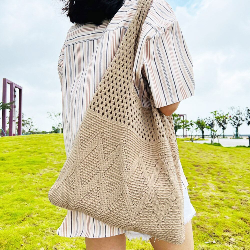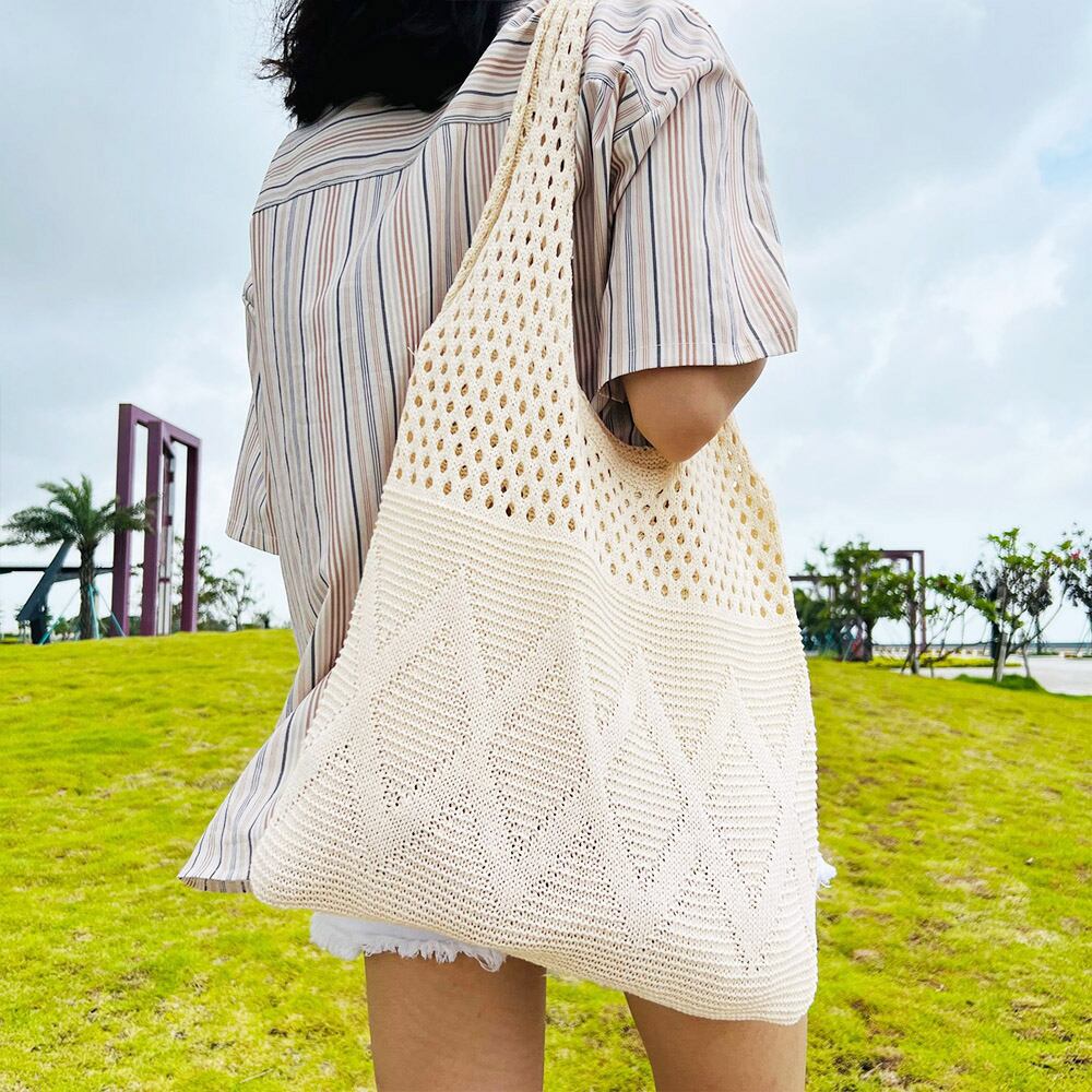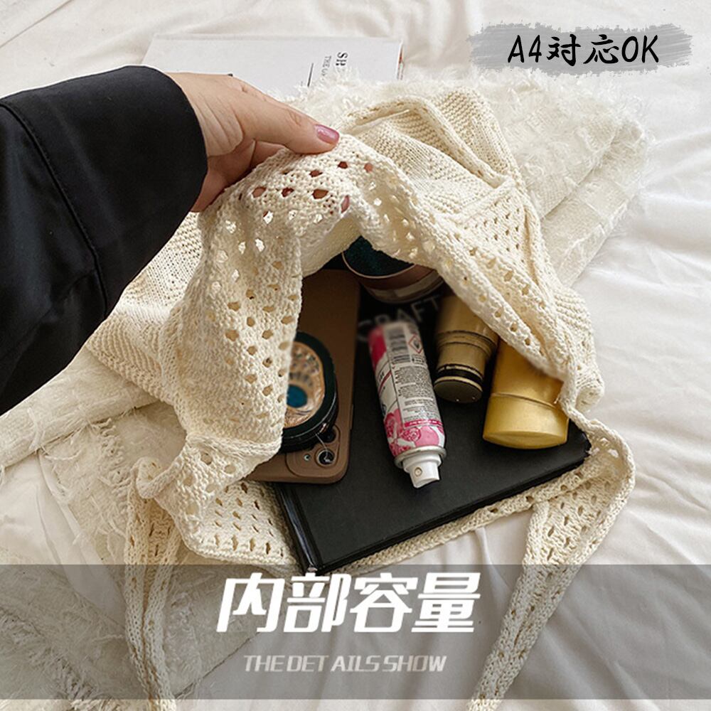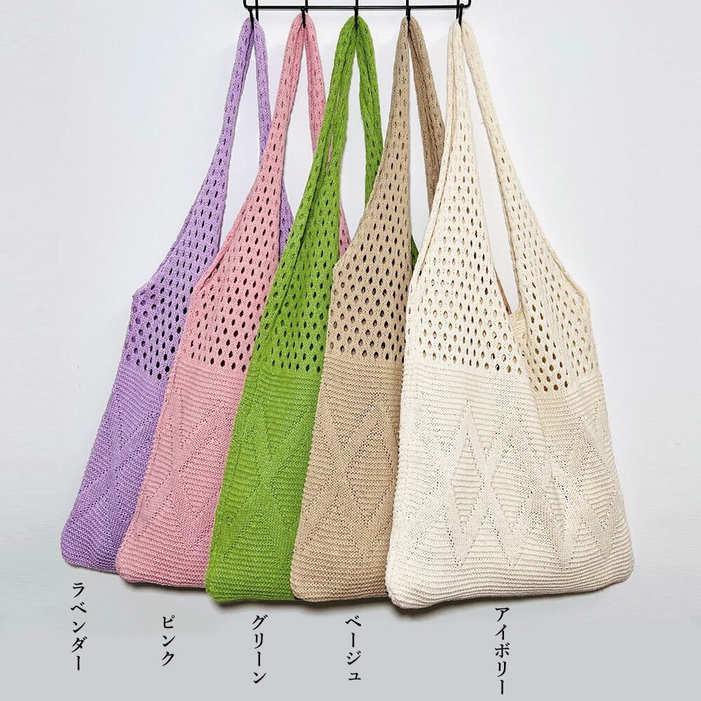 ワンショルダーバッグ レディース 透かし編み ニット鞄 軽量 肩掛けカバン 大きめ カジュアル バッグ 大容量 きれいめオルチャン バッグ a4バッグ通勤軽い おしゃれサブバッグマルチの網目が遊び心満載でモダンな今っぽ編み込みスクエア型ニットバッグマチの無いデザインながらも伸びるので、荷物を入れると膨らんで柔らかいシルエットになり可愛く女性らしいバッグとして使うのはもちろん、差し色アイテムとしていつものコーデに取り入れるだけでおしゃれ感&トレンド感がプラスされる素材:ポリエステルカラー:アイボリー/ベージュ/ラベンダー/ピンク/グリーンサイズ:高さ:約36cm 底横幅:約39cm 持ち手高さ:約23cm(調節不可、取り外し不可)重さ:約173g裏地:なし内ポケット:なし生産国:中国※すべて平置きサイズです(採寸方法違いより、多少の誤差がございますので、ご了承ください)。