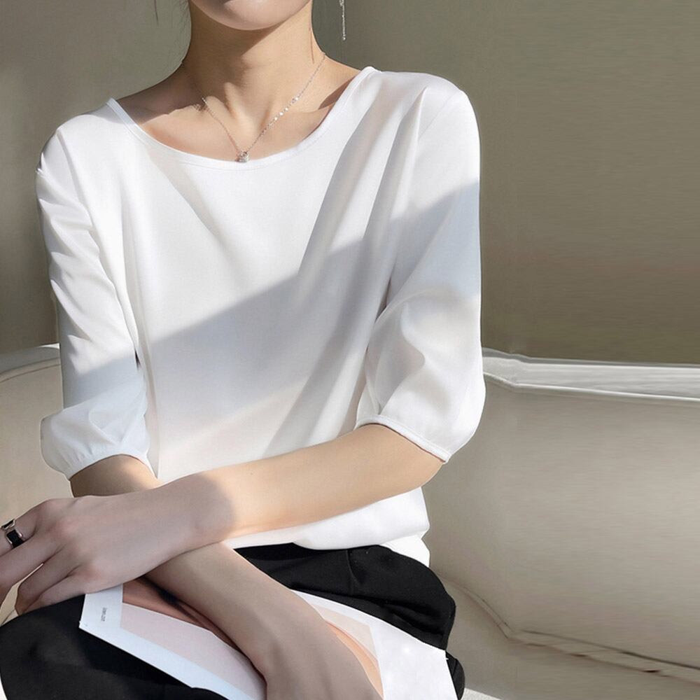 無地 きれいめ 五分袖 薄手シャツ 大人 女性 オフィス カジュアル ゆったり おしゃれ 着やせ 韓国ファッションカジュアルブラウス とろみトップス プルオーバーサラッと快適な肌触りと大人ニュアンスカラーが可愛いシャツブラウスです。