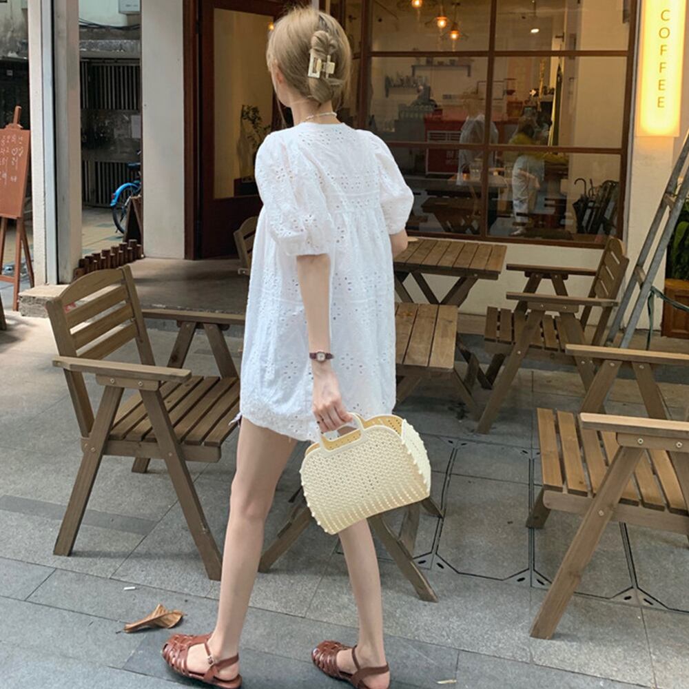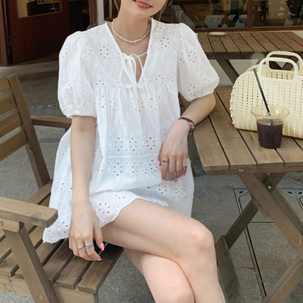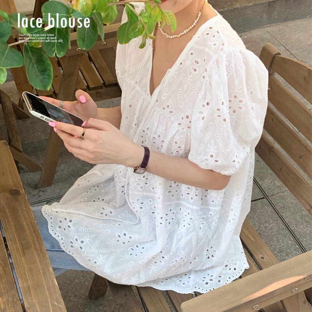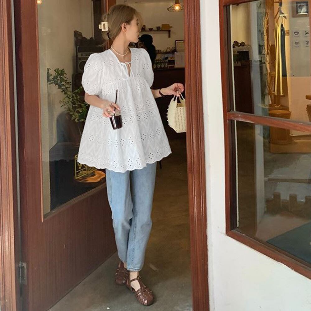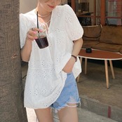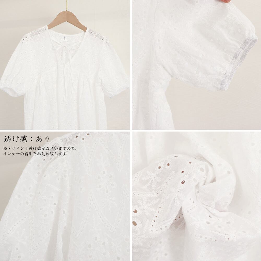レディース 大人可愛い 透かし彫り 夏トップス白 おしゃれプルオーバー 透け感 パンチングレース ペプラムブラウス半袖夏服 パフスリーブ きれいめブラウス白 韓国ファッション繊細なレース素材と女性らしいデザインが魅力のVネックブラウスですVネックに開いた胸元は、デコルテを綺麗にすっきりと見せてくれます涼やかな印象を与えてくれるので、これからの季節にぴったりです体のラインを拾わないゆったりとしたシルエットで、着心地も快適です素材:綿65%+ポリエステル35%カラー:ホワイトサイズ:M/L[M]着丈:約75cm 肩幅:約33cm 袖丈:約25cm ゆき:約41.5cm 身幅:約46cm 胸囲:約92cm[L]着丈:約77cm 肩幅:約34cm 袖丈:約25cm ゆき:約42cm 身幅:約49cm 胸囲:約98cm裏地:なし伸縮性:なし透け感:あり※デザイン上透け感がございますので、インナーの着用をお勧め致します生産国:中国※すべて平置きサイズです(採寸方法違いより、多少の誤差がございますので、ご了承ください)。