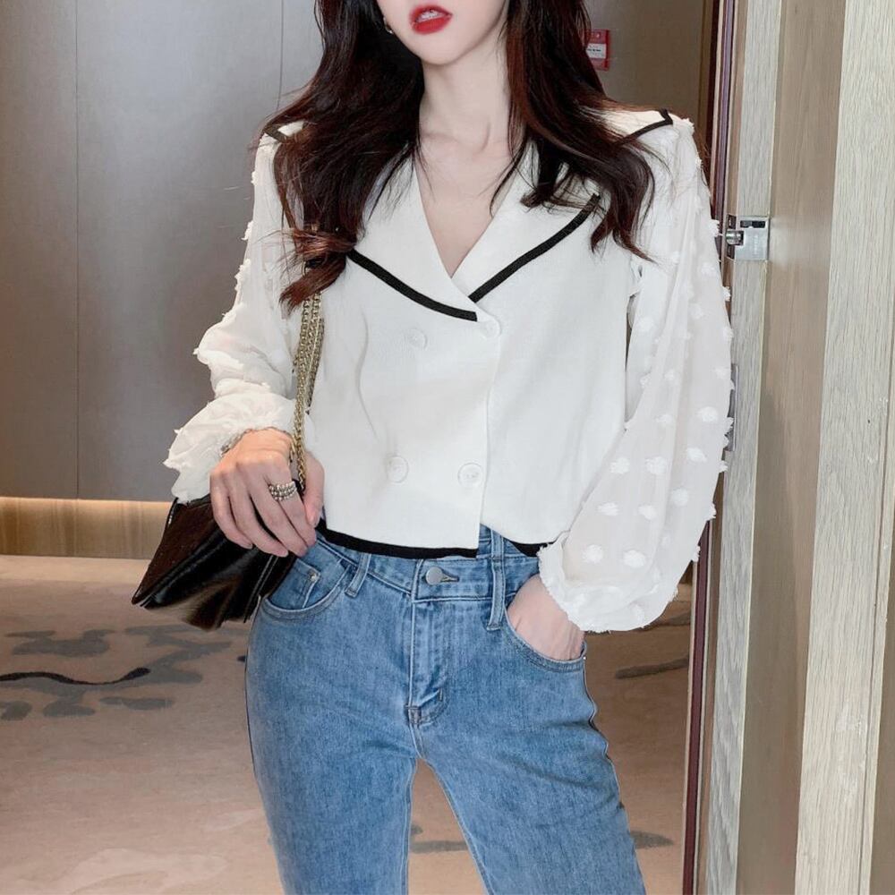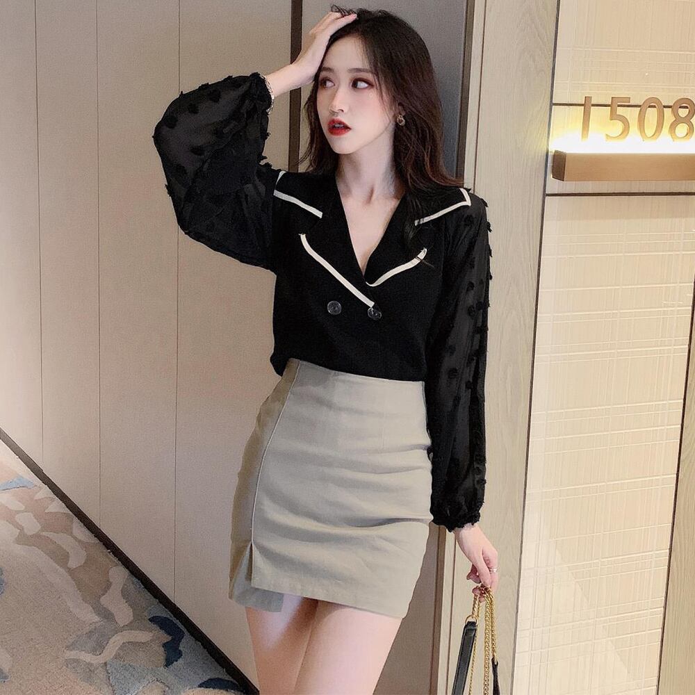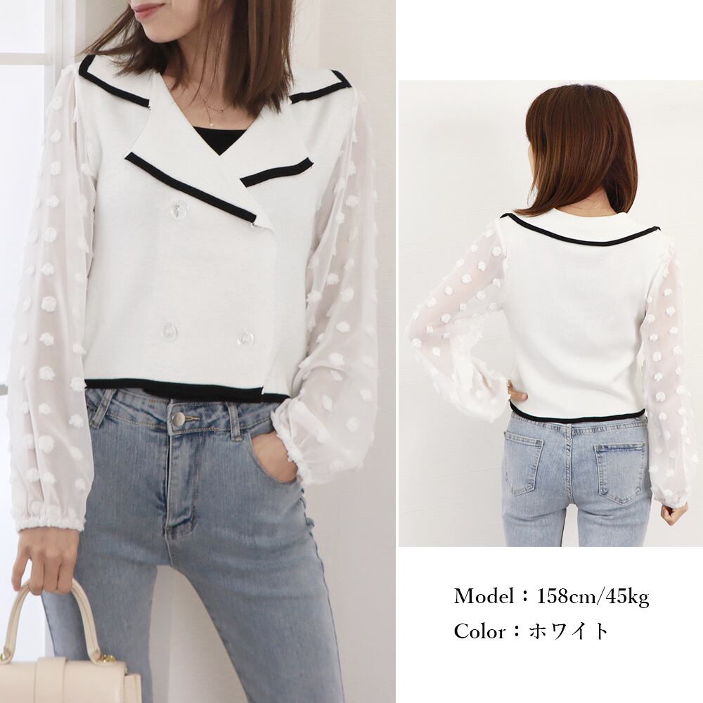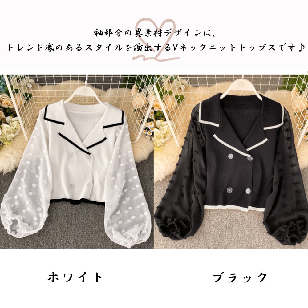 Vネック ニットブラウス ダブルブレスト 袖切り替え おしゃれニットトップス オフィスカジュアル 大人可愛い 韓国春秋夏袖チュールニット春 スキッパーブラウス ショート丈トップス袖部分の異素材デザインは、トレンド感のあるスタイルを演出するVネックニットトップスですVネックやビッグ襟と組み合わせることで、よりお洒落感のある印象を与えます>スリーブは透け感のあるシフォン袖で爽やかに女性らしさをアピールできますカジュアルなデイリーウェアとしても、フォーマルなシーンでのアイテムとしてもおすすめです素材:ポリエステル100%カラー:ブラック/ホワイトサイズ:ワンサイズ着丈:約46m 肩幅:約36cm 袖丈:約56cm ゆき:約74cm 身幅:約40cm 胸囲:約80-140cm裏地:なし伸縮性:ニット部分のみあり透け感:ニット部分ホワイトのみややあり/袖部分あり生産国:中国※すべて平置きサイズです(採寸方法違いより、多少の誤差がございますので、ご了承ください)。