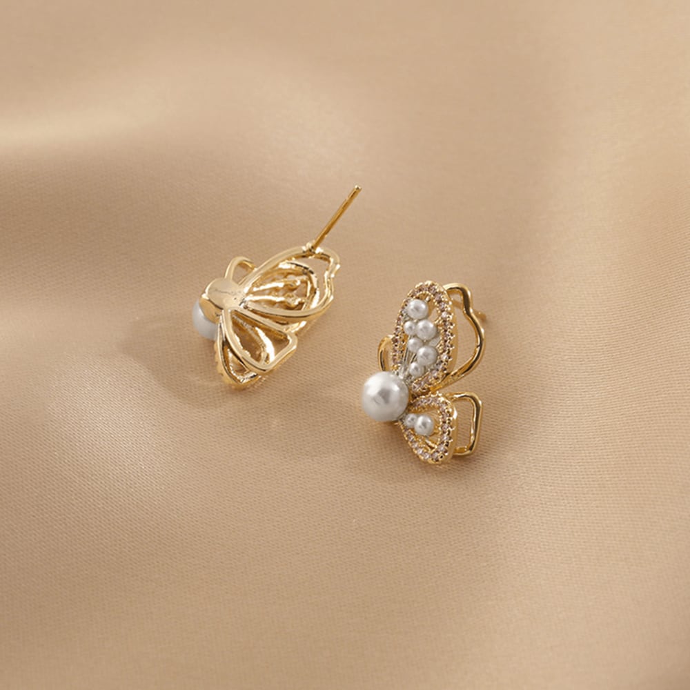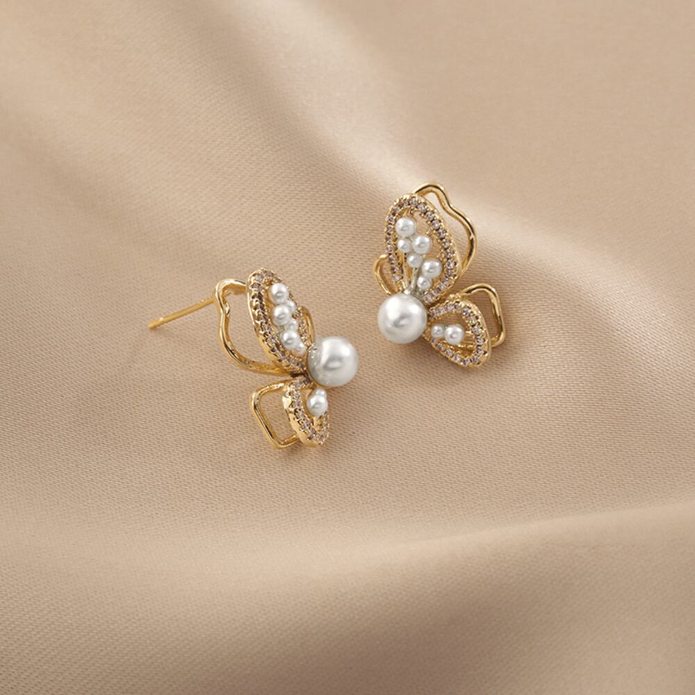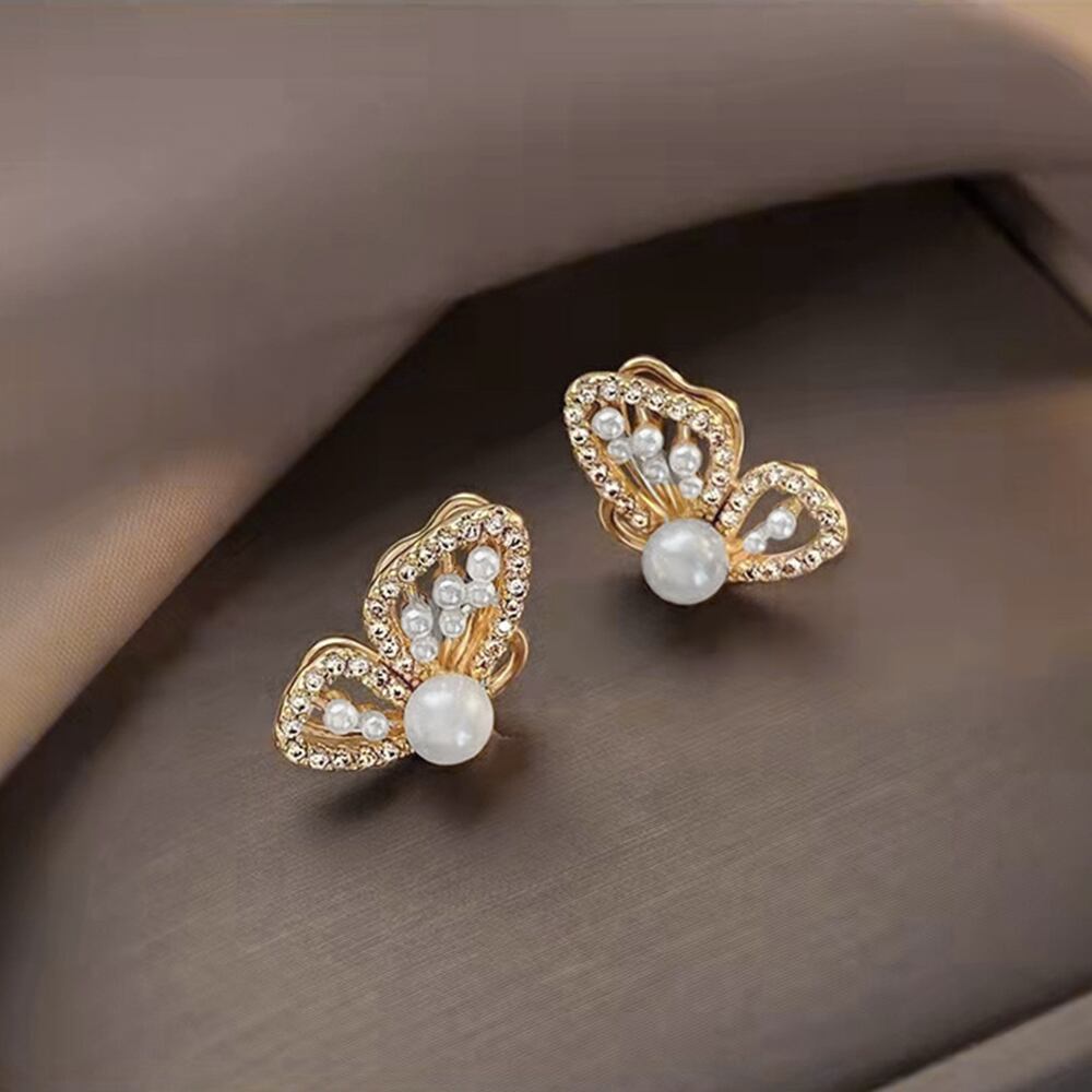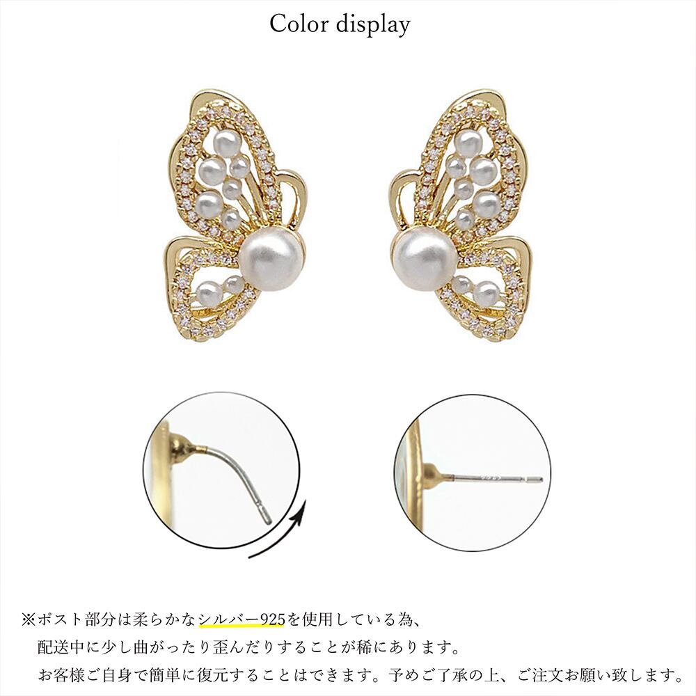 フェイクパールピアス 上品 キラキラ パーティーアクセサリー 清楚 ジュエリー 華奢 小ぶりピアス フェミニン 耳飾りピアス 大人可愛い ビジューピアス女性 スタイリッシュ個性煌びやかなバタフライモチーフが耳元を華やかに演出するピアス小ぶりのサイズ感ながらもワンポイントパールデザインが、女性らしさを引き立てるアイテム上品な雰囲気がありながらも、程よい存在感でデイリーからオケージョンまで使いやすいゴールドカラー素材:合金+フェイクパール+ラインストーンカラー:ゴールド長さ:約1.8cm生産国:中国※ポスト部分は柔らかなシルバー925を使用している為、配送中に少し曲がったり歪んだりすることが稀にあります。
