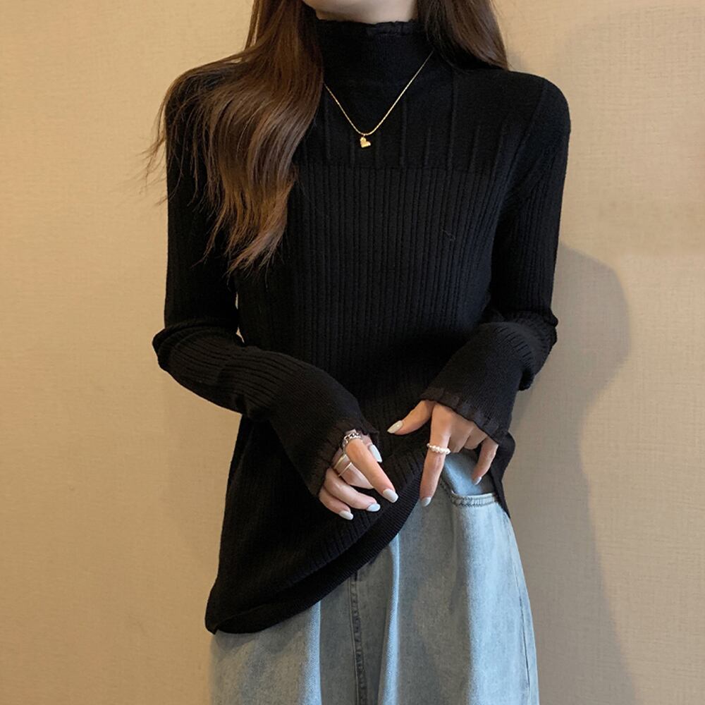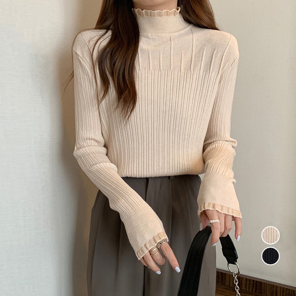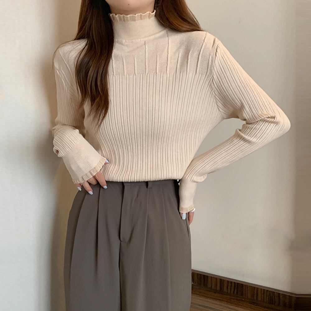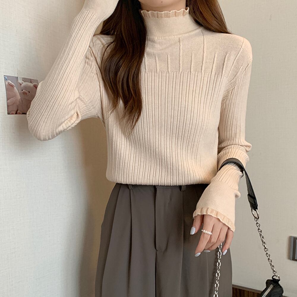 ニットウェア 韓国風 ハイネック ニットセーター 着回し 大人可愛い ニットプルオーバー 普段着ニットソー きれいめ大人ニットインナー 着やせ 長袖ニット カジュアルトップス無地シンプルデザインのハイネックインナーニットトップスネックと袖で小さいフリルデザインを施し、洗練された女性らしい印象に合わせるボトムスを選ばず幅広く使えるので、普段使いはもちろん、スカートやスラックスにジャケットを合わせてオフィスなどでもOK素材:ポリエステル65%+アクリル35%カラー:ブラック/ベージュサイズ:ワンサイズ着丈:約60cm 肩幅:約34cm 袖丈:約55cm ゆき:約72cm 身幅:約41cm 胸囲:約82-130cm裏地:なし伸縮性:あり透け感:ベージュのみややあり※ニット素材の為、伸縮具合によっては編みに隙間を感じる場合があります生産国:中国※すべて平置きサイズです(採寸方法違いより、多少の誤差がございますので、ご了承ください)。