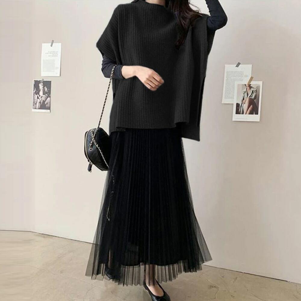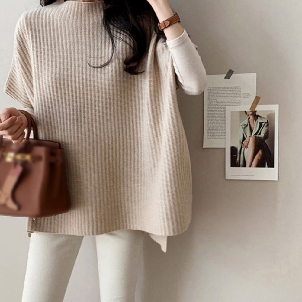 韓国 フレンチスリーブニット スリット リブニットポンチョ 重ね着 大人カジュアル ニットセーター プチハイネックベスト体型カバーベスト黒 無地シンプルニット 秋冬ニットトップスレイヤードにマストなニットベスト肩先にかかるフレンチスリーブ仕様で、肩周りから二の腕をカバー深めに入ったサイドスリットが女性らしい抜け感を演出してくれる飽きのこないシンプルデザイン、レイヤード次第で雰囲気変えられて、コーデが楽しめる!