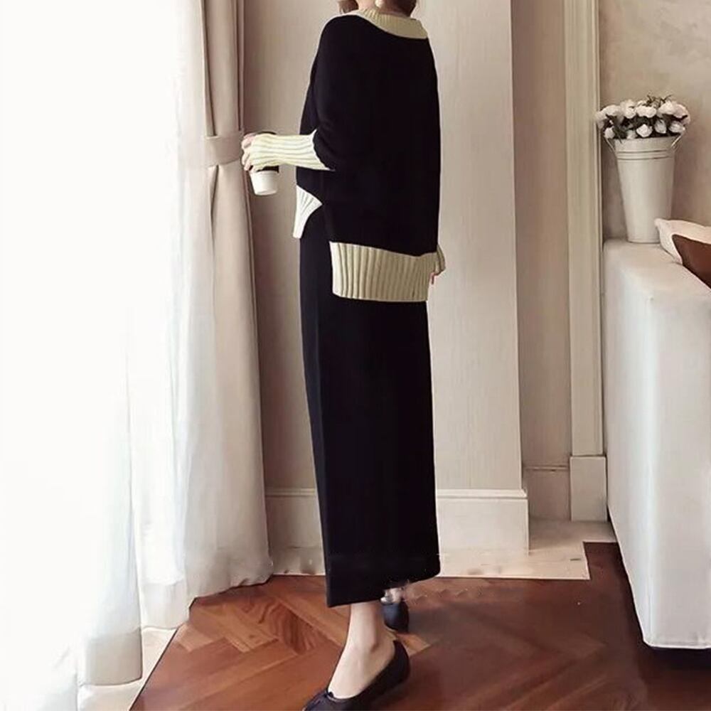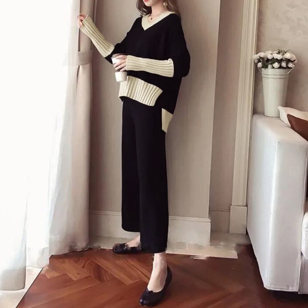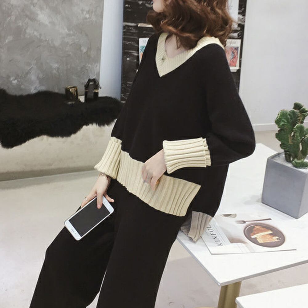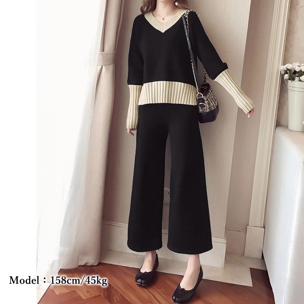 ツーピースセット Vネック サイドスリット ニットトップス カジュアル ニットワイドパンツ 秋冬2点セット 30代40代ニットアンサンブル 長袖上下セット春秋 らくちん無地パンツ首元が綺麗に見えるV ネックトップスとリラクシーなニットワイドパンツのセットアップ大胆に入ったサイドのスリットが着映えるポイントに♪前後にシルエット差のあるデザインで前だけインしてトレンド感をパンツのウエストはゴムになっているので腰回りも楽ちんモノトーンのバイカラーがエレガントな女性を演出。