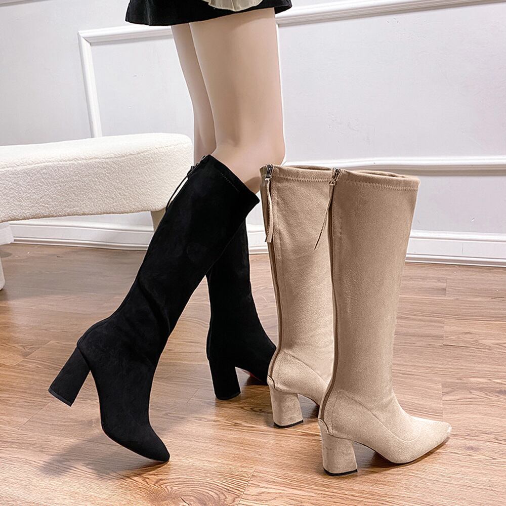 バックジップブーツ チャンキーヒール 膝下 歩きやすい シューズ 秋冬 カジュアル きれい 上品 人気 美脚脚長ブーツ太ヒールブーツ大人 韓国靴 スエード調 ジョッキーブーツすっきりとしたシルエットが上品な足元を演出してくれるスエード調ロングブーツバックにはファスナー付きなので脱ぎ履きラクチンシンプルなデザインが大人らしさを演出し、どんなコーデにも合わせやすい甲素材:合成繊維底素材:合成底カラー:ブラック/ベージュサイズ:22.5cm/23.0cm/23.5cm/24.0cm/24.5cm/25.0cm(カッコ内は靴底表記となります)[22.5]長さ:約22.5cm 幅:約7.0cm 筒丈:約35.5cm[23.0]長さ:約23.0cm 幅:約7.1cm 筒丈:約36.0cm[23.5]長さ:約23.5cm 幅:約7.2cm 筒丈:約36.5cm[24.0]長さ:約24.0cm 幅:約7.3cm 筒丈:約37.0cm[24.5]長さ:約24.5cm 幅:約7.4cm 筒丈:約37.5cm[25.0]長さ:約25.0cm 幅:約7.5cm 筒丈:約38.0cmヒール(全サイズ):約7.5cm重さ(両足):約518g-611g生産国:中国※すべて平置きサイズです(採寸方法違いより、多少の誤差がございますので、ご了承ください)。