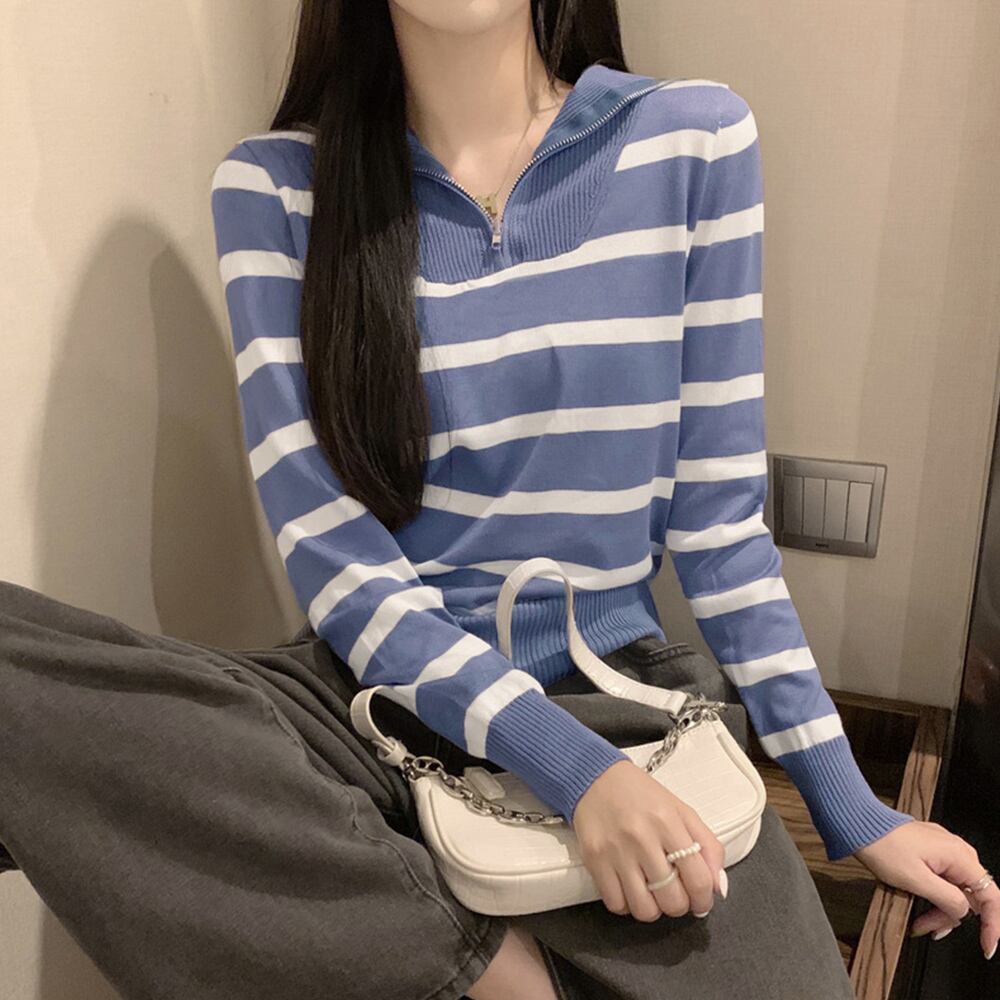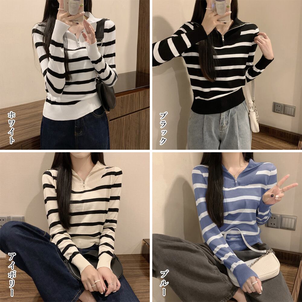 大人カジュアル リブニット レディース 着回し ニットウエア 普段着 ニットセーター 韓国風 おしゃれ ニットソー重ね着長袖ニットインナー 着やせ ニットソー 春秋冬リブセーター大人カジュアルにトレンドのハーフジップデザインのボーダーニットトップス首元のジップ仕様は、暖かなハイネックとして着たり、衿元を思いきり開けて抜け感を出したり一枚はもちろん、インナーとしてもオシャレに着こなせる素材:ポリエステル65%+アクリル35%カラー:ブラック/ホワイト/アイボリー/ブルーサイズ:ワンサイズ着丈:約50cm 肩幅:約34cm 袖丈:約56cm ゆき:約73cm 身幅:約44cm 胸囲:約88-135cm裏地:なし伸縮性:あり透け感:淡色のみややあり※ニット素材の為、伸縮具合によっては編みに隙間を感じる場合があります生産国:中国※すべて平置きサイズです(採寸方法違いより、多少の誤差がございますので、ご了承ください)。