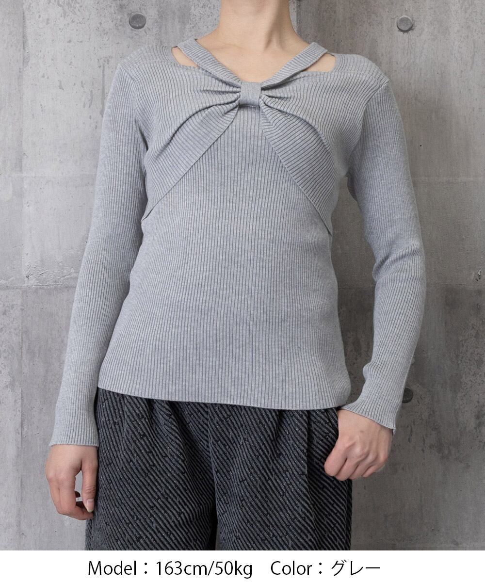 フロントの大きいリボンデザインとホルターネックがお洒落なニットトップス。