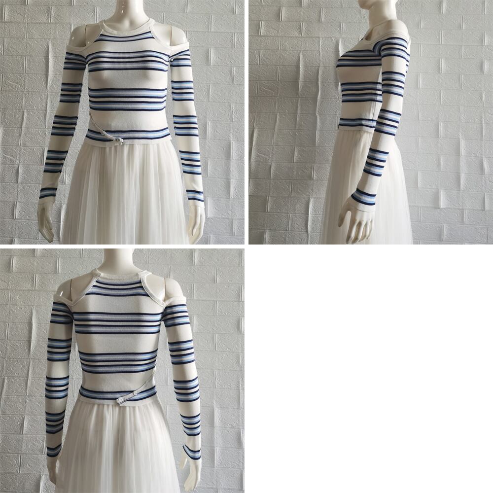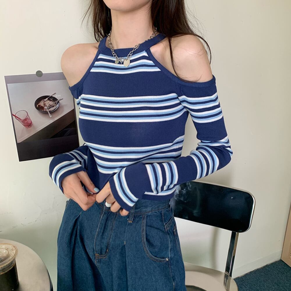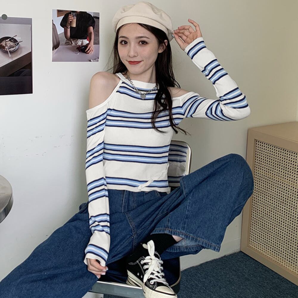 肩開き ボーダー柄ニットトップス 韓国風