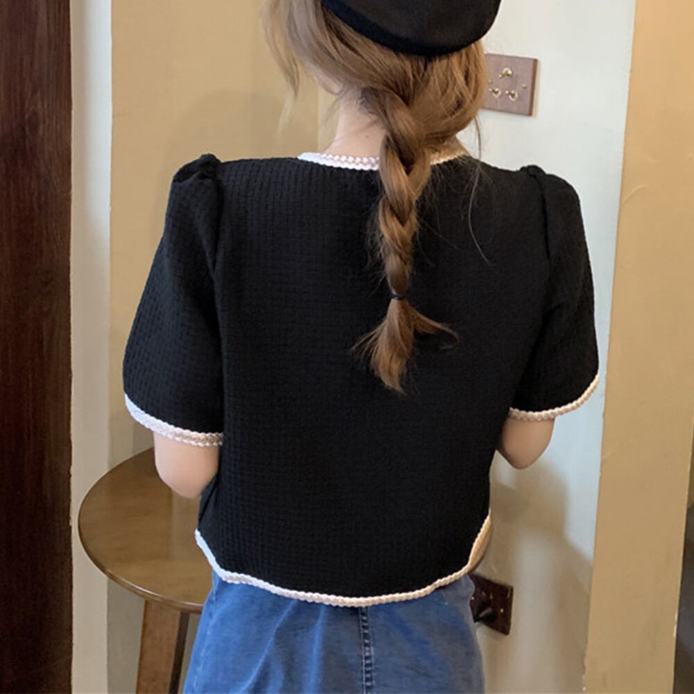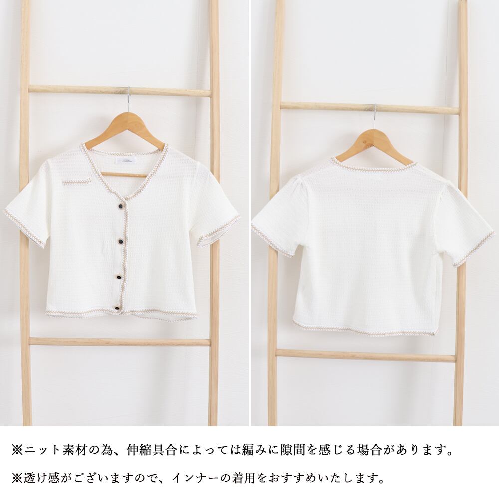 サマーカーディガン Vネック 透かし編みニット ショートカーデ 立体感 シャツ ラメ入り羽織り 夏 トップス バイカラーレトロボタンお洒落 配色カーデかわいい 開襟シャツ大人上品スッキリ魅せが得意なVネックにラメブレードをあしらったコンパクトジャケットポケットや、存在感のある釦がレトロで、女性らしいさを演出するツイード風デザインが夏の綺麗め&甘めなコーデにぴったり存在感のあるアイテムなので、主役にコーディネートするのがおすすめ♪素材:ポリエステル70%+綿30%カラー:ブラック/ホワイトサイズ:ワンサイズ着丈:約43cm 肩幅:約36cm 袖丈:約17cm ゆき:約35cm 身幅:約41cm 胸囲:約82-110cm裏地:なし伸縮性:あり透け感:あり生産国:中国※すべて平置きサイズです(採寸方法違いより、多少の誤差がございますので、ご了承ください)。