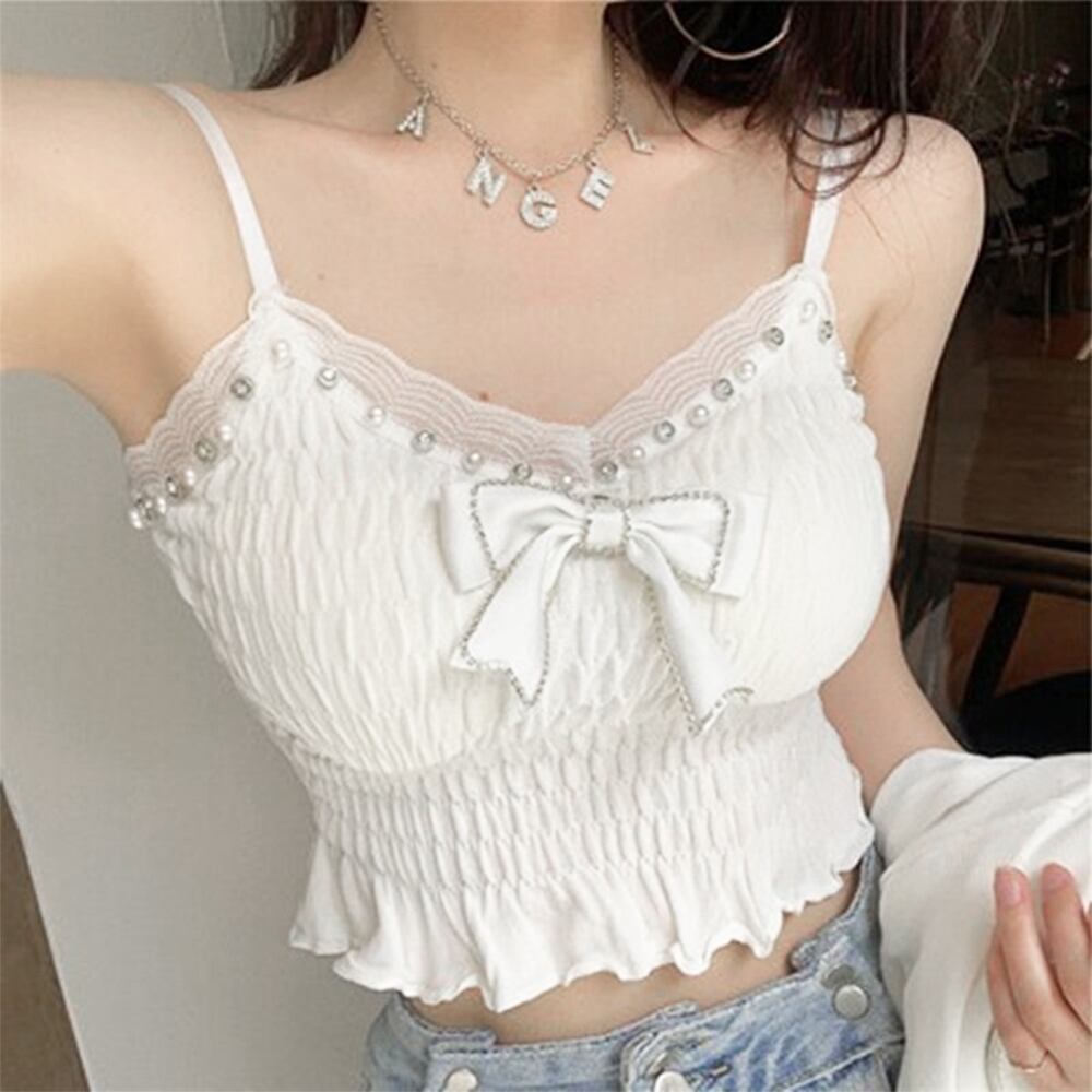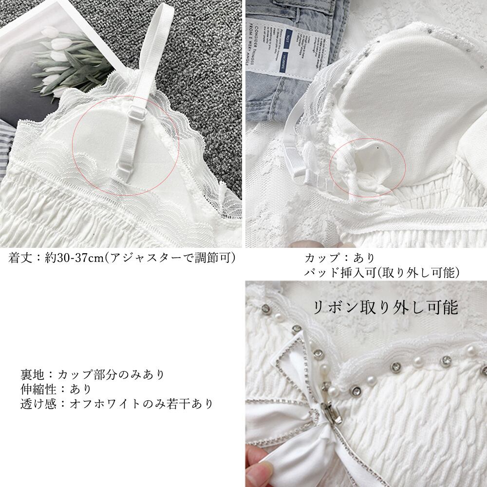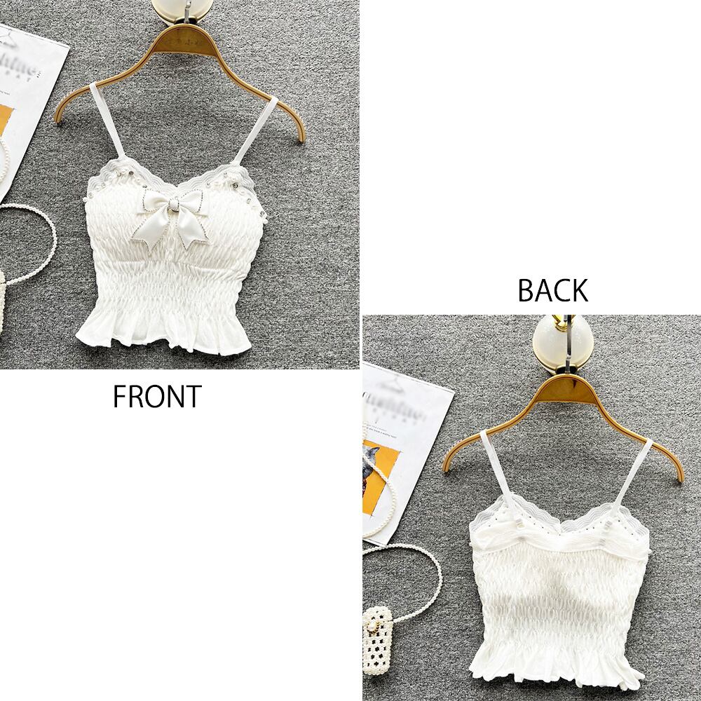 インナー トップス シャーリング カップインキャミ レディース ギャザー ショルダーストラップ リボン付き お洒落カップ付キャミ 夏 フリル ストレッチ セクシー 可愛いフェイクパールときらきら輝くラインストーンをあしらったリボン付きキャミソールです伸縮性が良く柔らかい素材で、ボディに程よくフィットするサイズ感が着用しやすいですインナー使いはもちろん、1枚でも決まるアイテムです素材:ポリエステル70%+綿30%カラー:ブラック/オフホワイトサイズ:ワンサイズ着丈:約30-37cm(アジャスターで調節可)トップバスト:約60-80cmアンダーバスト:約56-76cmワイヤー:なしカップ:ありパッド挿入可(取り外し可能)裏地:カップ部分のみあり伸縮性:あり透け感:オフホワイトのみ若干あり生産国:中国※すべて平置きサイズです(採寸方法違いより、多少の誤差がございますので、ご了承ください)。