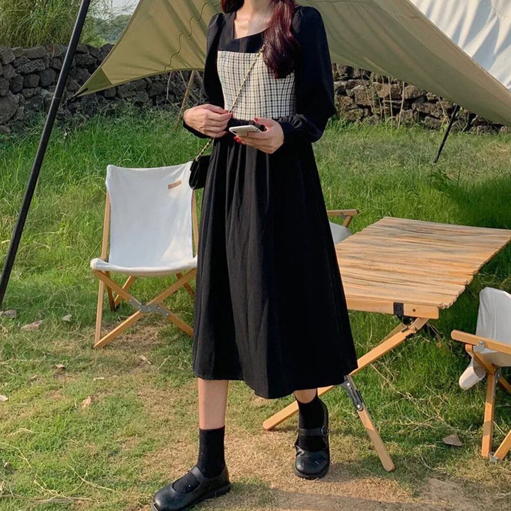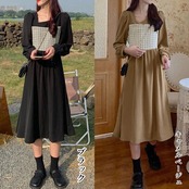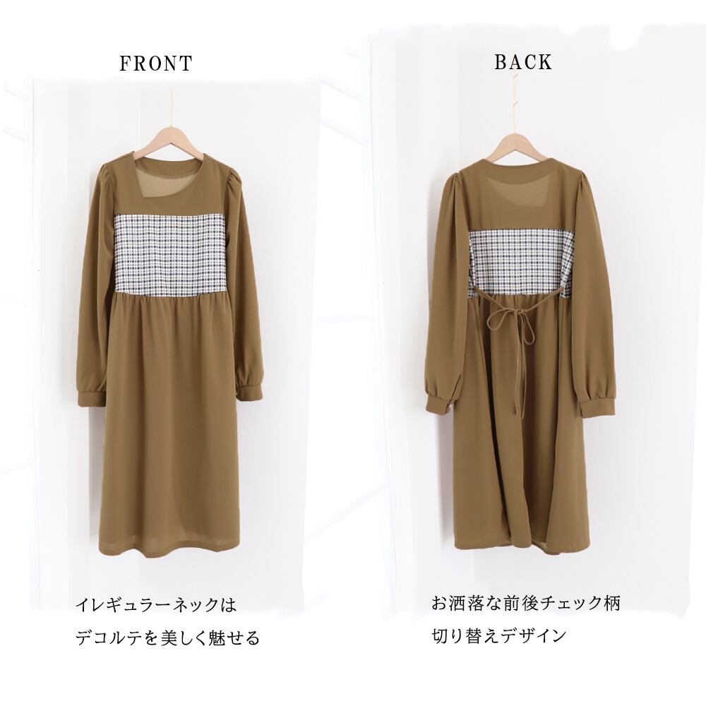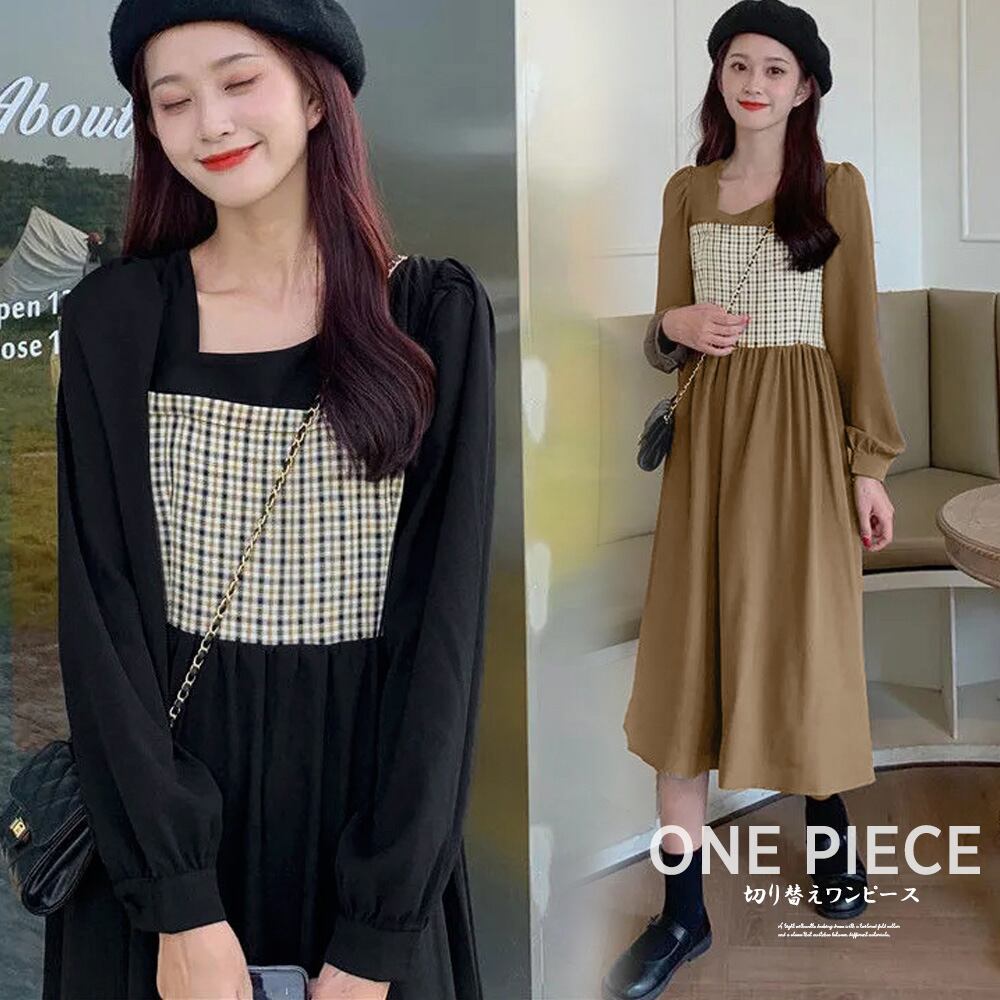 ビスチェ風 ロングワンピース ウエストマーク フレアワンピース おしゃれ チェック柄 ミモレワンピ 着やせ オルチャン春夏ワンピース韓国 ワンピ 体型カバー デコルテ見せワンピチェック柄切り替えデザインがお洒落な長袖ワンピースイレギュラーネックはデザインのポイントで、デコルテを美しく魅せるコーデが決まらないとき、この一枚でオシャレに仕上がる素材:ポリエステル100%カラー:ブラック/キャメルベージュサイズ:ワンサイズ(XL)総丈:約108cm 肩幅:約36cm 袖丈:約64cm ゆき:約82cm 身幅:約50cm 胸囲:約100cm ウエスト:約94cm ヒップ:約140cm裏地:なし伸縮性:なし透け感:なし生産国:中国※すべて平置きサイズです(採寸方法違いより、多少の誤差がございますので、ご了承ください)。