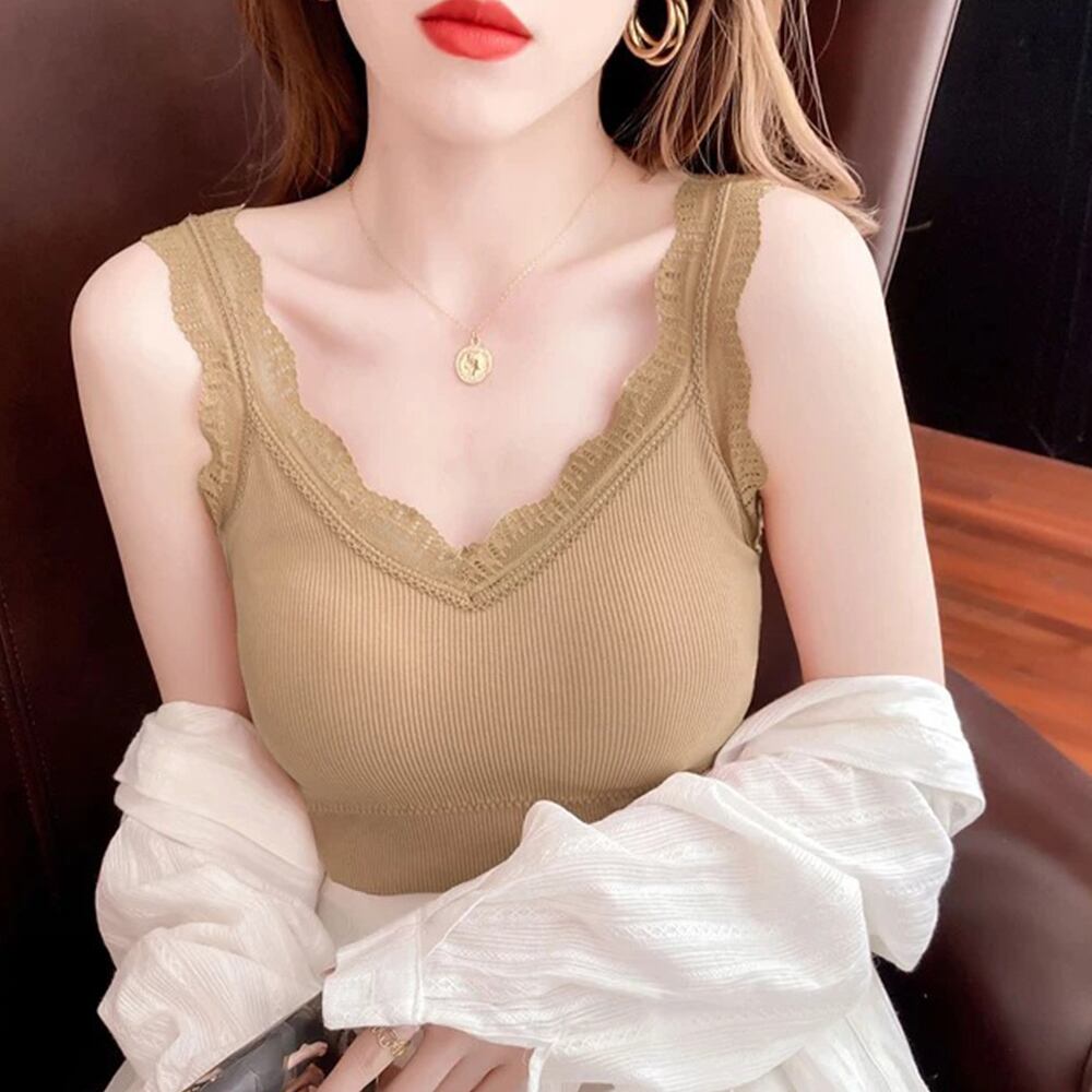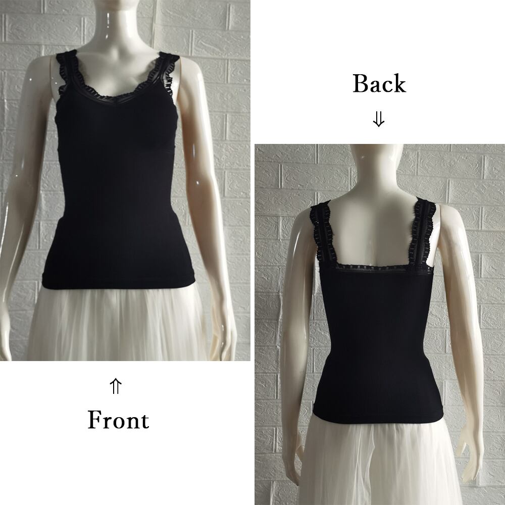 重ね着 レースキャミソール レディース Vネックセクシー下着 ノースリーブ 韓国風 アンダーウェア シンプル着やせタンクトップ おしゃれカットソー 無地インナートップデコルテラインを綺麗魅せVネックのカップ付きタンクトップス肩と胸元のレースが可愛らしいデザインなのでインナーとして取り入れるだけでフェミニンな印象にアンダーウェアとしてはもちろん、レイヤードコーデの見せインナーとしても活躍する万能アイテム素材:ナイロン80%+ポリウレタン20%カラー:ブラック/グレー/ダークベージュ/ブルー/ピンクブラウン/オレンジサイズ:ワンサイズ着丈:約52cmトップバスト:約60-80cmアンダーバスト:約56-78cmワイヤー:なしカップ:あり裏地:胸元のみあり伸縮性:あり透け感:なし生産国:中国※すべて平置きサイズです(採寸方法違いより、多少の誤差がございますので、ご了承ください)。
