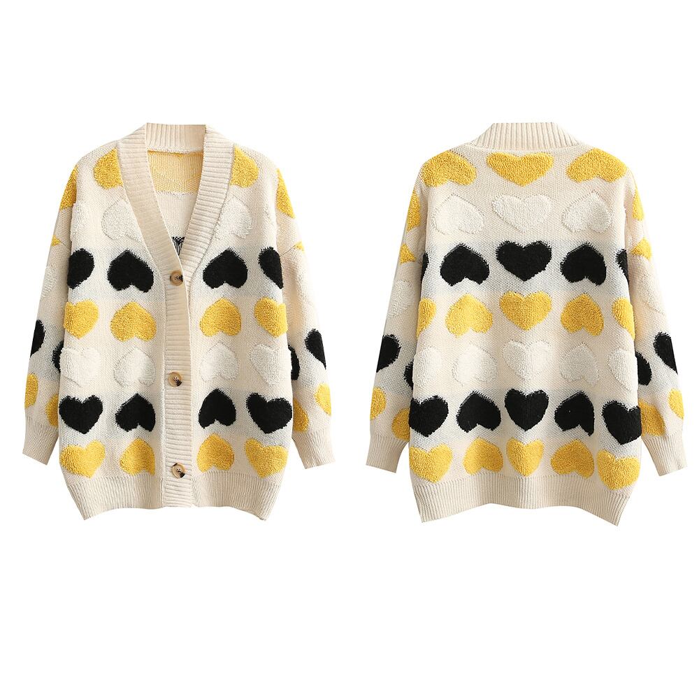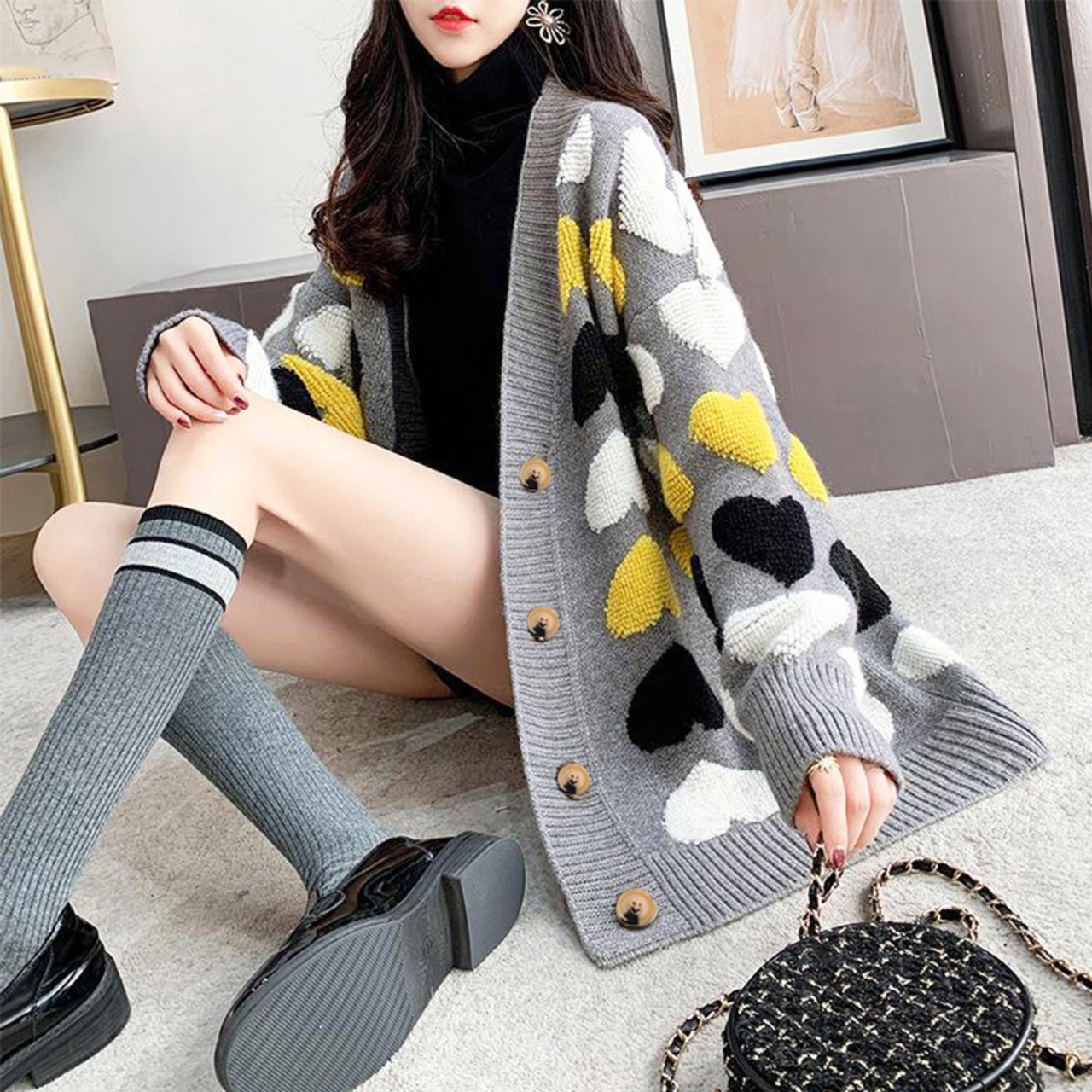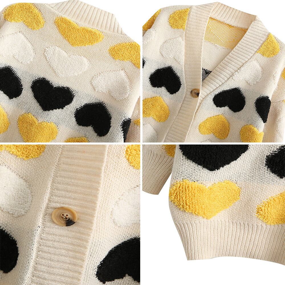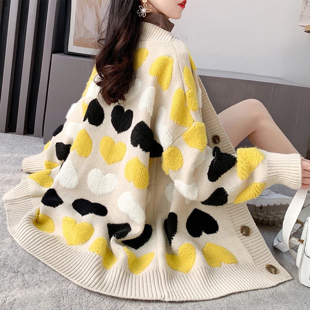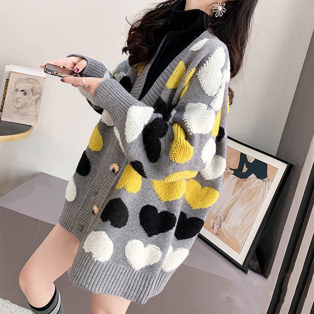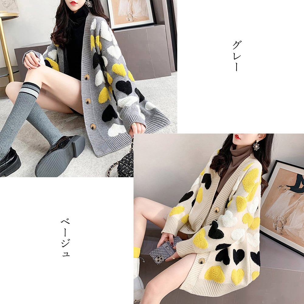 ニットアウター ゆったり 長袖カーデ ハート柄 オーバーサイズ 韓国ファッションアウター 秋冬 体型カバー 着やせ トップス明るい配色のハート柄が浮き出るもこもこボアでアクセントになるニットカーディガン暗くなりがちな秋冬では存在感抜群ながらも、季節に馴染みやすい色合いなので派手過ぎず着こなしやすいトップスボトムスはあえてシンプルにして、カーデを主役にするコーデをおすすめ素材:アクリル100%カラー:ベージュ/グレーサイズ:ワンサイズ着丈:約72cm 肩幅:約62cm 袖丈:約42cm ゆき:約73cm 身幅:約63cm 胸囲:約126-150cm裏地:なし伸縮性:あり透け感:なし生産国:中国※すべて平置きサイズです(採寸方法違いより、多少の誤差がございますので、ご了承ください)。