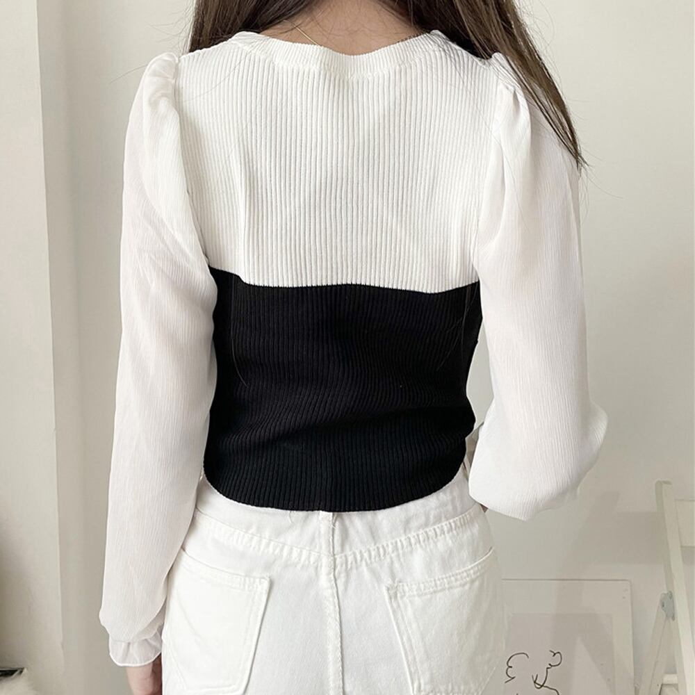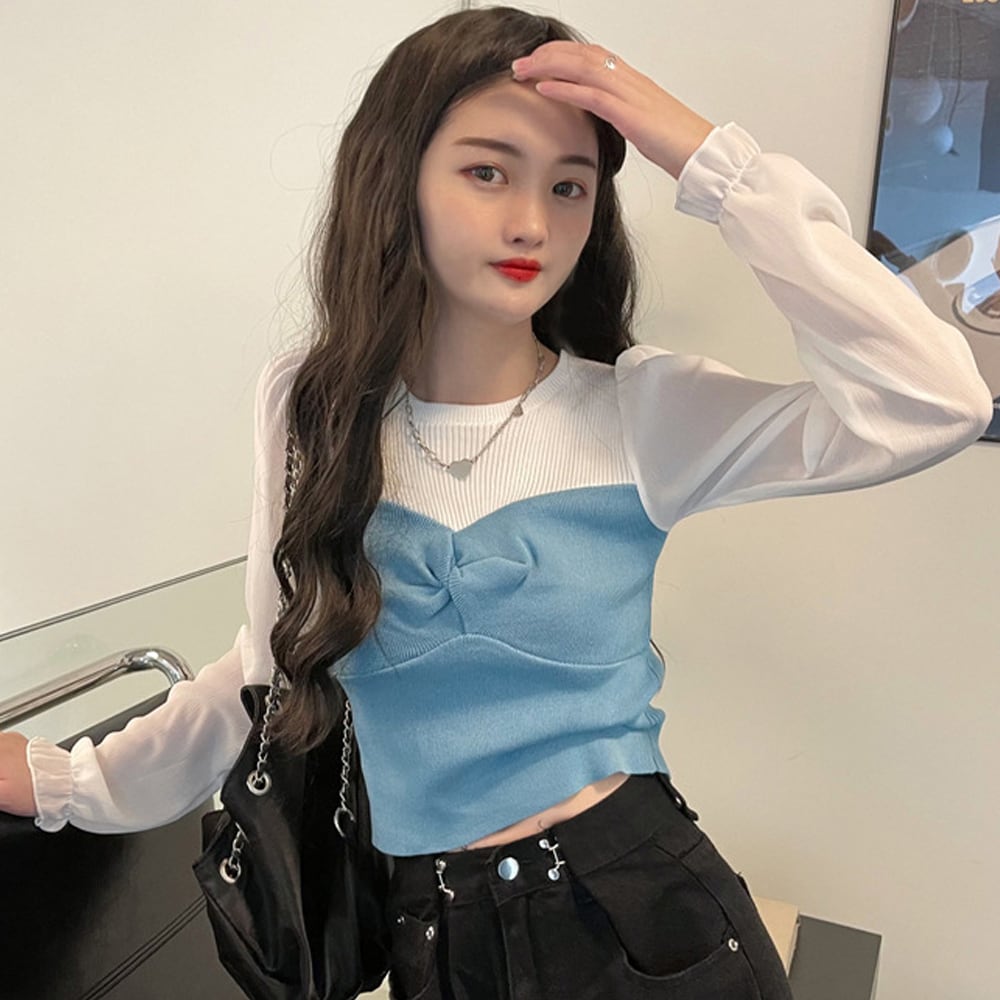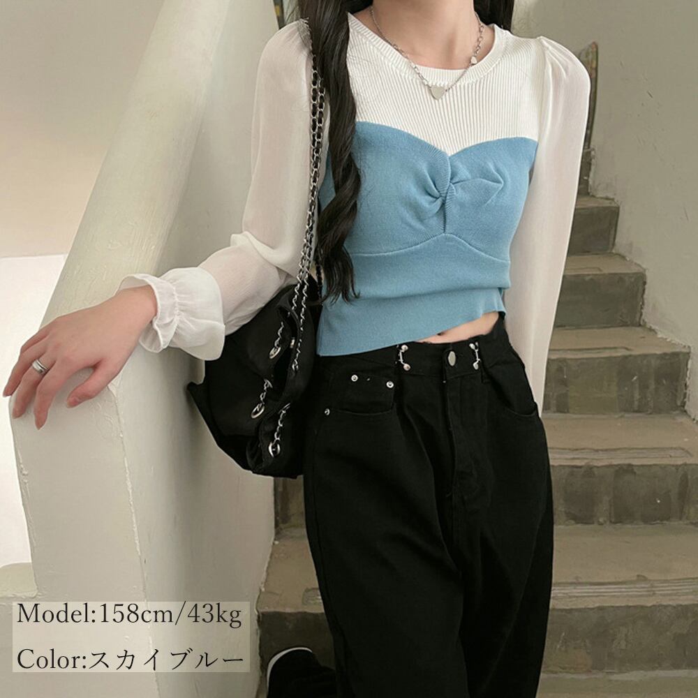ショット丈トップス 袖シフォン ラウンドネック 切り替え ブラウス 異素材 長袖リブニット 着やせ 透け感 かわいい プルオーバー 秋冬アームの切り替えに十分なタックを加えることで自然なボリューム感に身頃は伸縮性があり、インスタイルもしやすいフェミニンなスカートとのコーディネートはもちろん、シンプルなデニムアイテムとの相性も抜群素材:ポリエステル75%+アクリル25%カラー:ブラック/スカイブルーサイズ:ワンサイズ着丈:約41cm 肩幅:約28cm 袖丈:約56cm ゆき:約70cm 身幅:約32cm 胸囲:約64-86cm裏地:なし伸縮性:身頃のみあり透け感:袖あり/白色部分ややあり生産国:中国※すべて平置きサイズです(採寸方法違いより、多少の誤差がございますので、ご了承ください)。