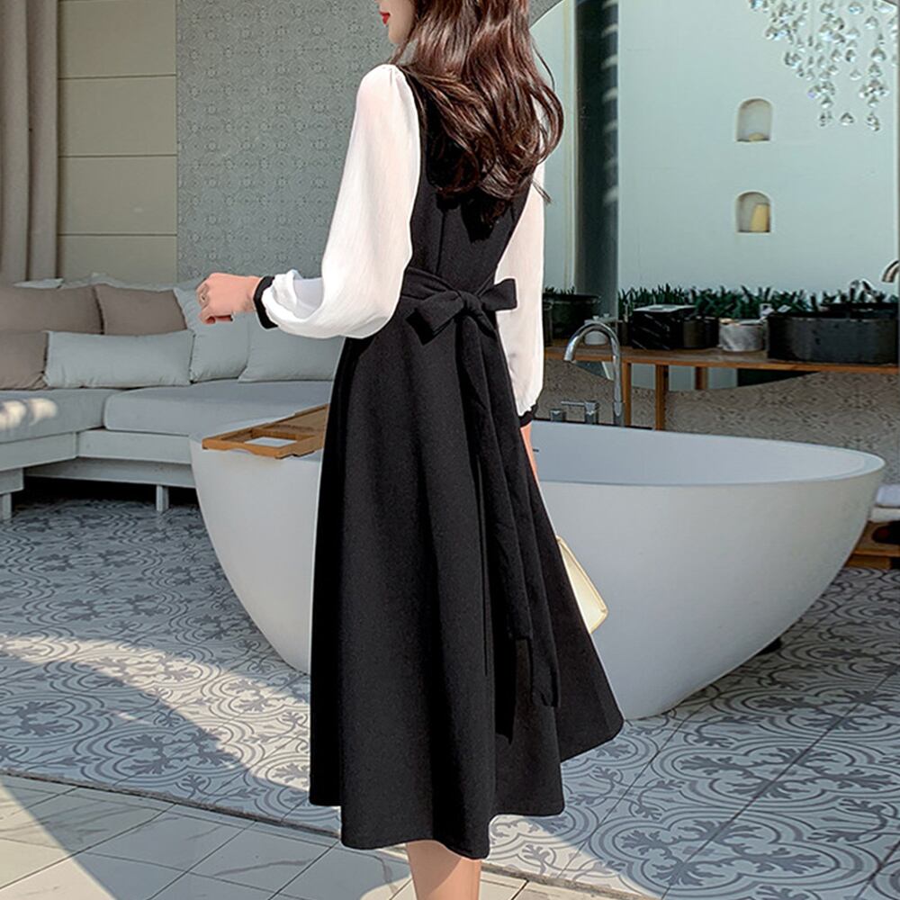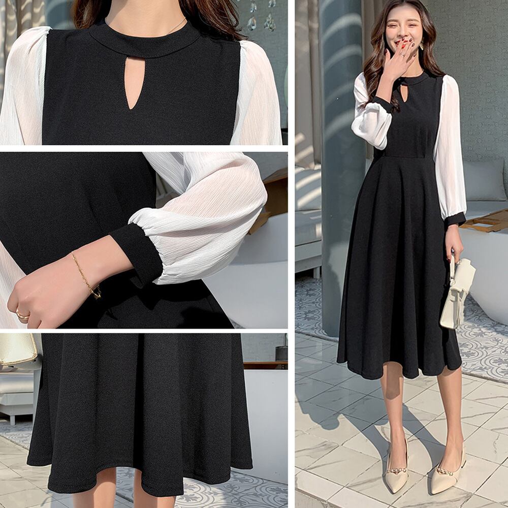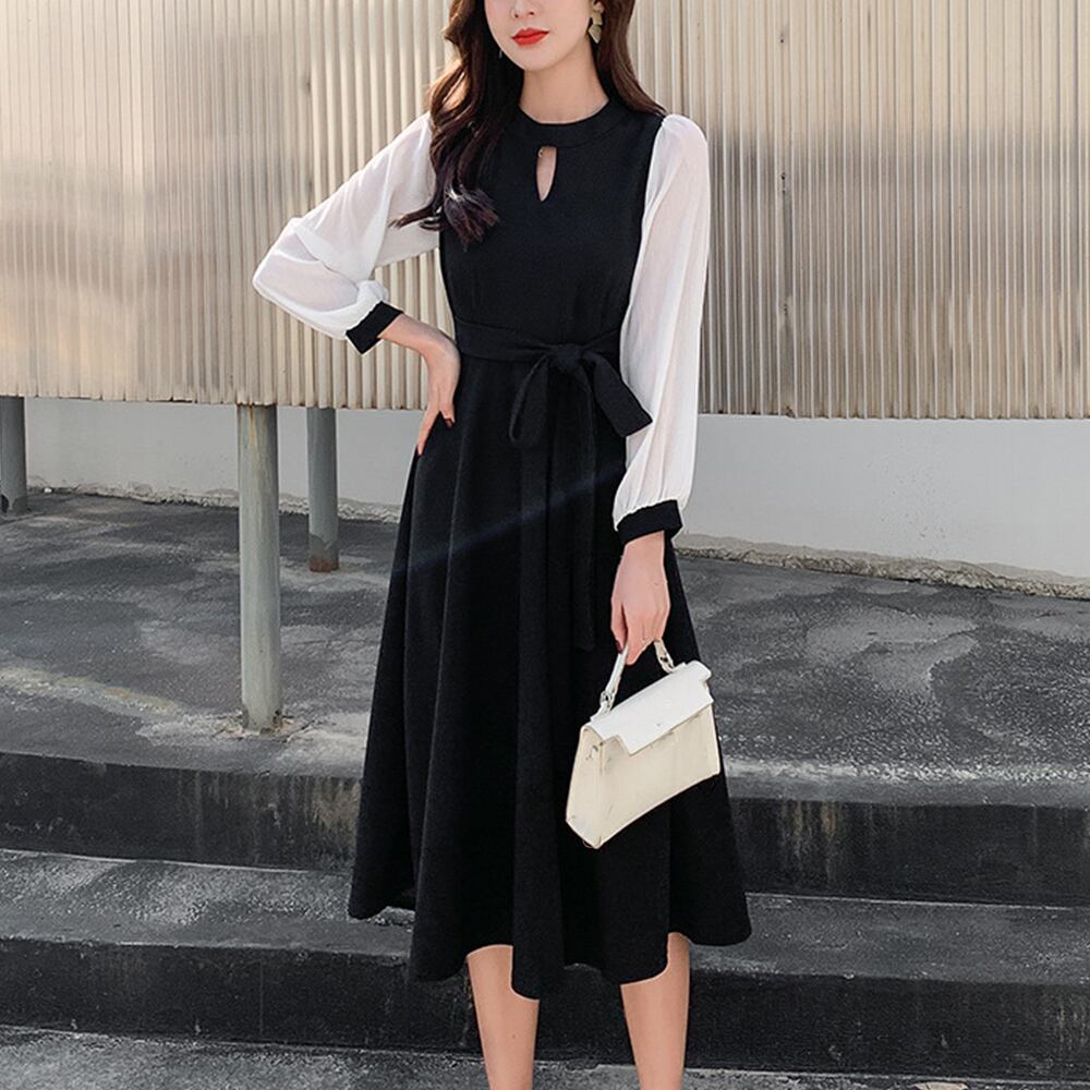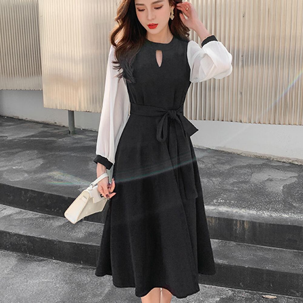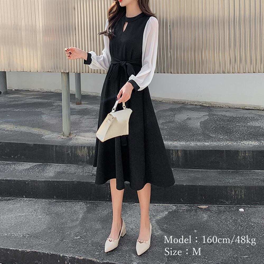 シフォンスリーブワンピース レトロ風 Aラインワンピース フォーマル 通勤OL 長袖ワンピース 春新作結婚式ドレス 韓国ファッション透け感のあるシフォンスリーブがアクセントのワンピースウエストリボンのデサインがワンポイントですが、トレンドライクなプリーツが、ウエストから裾まで施されているので、上品な雰囲気を引き立てます一枚着てだけでも、アウターの重ね着も、おしゃれに着こなせます、これからの季節にコーデが完成する素材:ポリエステル100%カラー:ブラックサイズ:M/L/XL[M]総丈:約107cm 肩幅:約32cm 袖丈:約55cm ゆき:約71cm 身幅:約42cm 胸囲:約84cm ウエスト:約72-82cm ヒップ:約104cm[L]総丈:約108cm 肩幅:約33cm 袖丈:約56cm ゆき:約72.5cm 身幅:約44cm 胸囲:約88cm ウエスト:約74-84cm ヒップ:約110cm[XL]総丈:約109cm 肩幅:約34cm 袖丈:約57cm ゆき:約74cm 身幅:約46cm 胸囲:約92cm ウエスト:約76-86cm ヒップ:約116cm裏地:なし伸縮性:ややあり透け感:袖のみあり生産国:中国※すべて平置きサイズです(採寸方法違いより、多少の誤差がございますので、ご了承ください)。