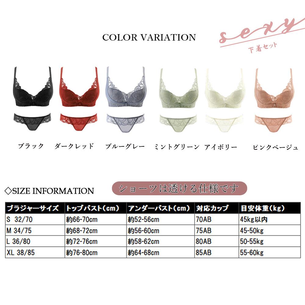 素材:ナイロン80%+ポリウレタン20%カラー:ブラック/アイボリー/ピンクベージュ/ブルーグレー/ダークレッド/ミントグリーンサイズブラジャー:[S]32/70 70AB トップバスト:約66-70cm アンダーバスト:約52-56cm[M]34/75 75AB トップバスト:約68-72cm アンダーバスト:約56-60cm[L]36/80 80AB トップバスト:約72-76cm アンダーバスト:約58-62cm[XL]38/85 85AB トップバスト:約76-80cm アンダーバスト:約64-68cmショーツ:(全サイズ共通)[S/M/L/XL]股上:約18cm ウエスト:約58-80cm ヒップ:約62-94cm●仕様:3/4カップ、ホック3列4段階調節、肩紐取外し不可、ワイヤー:なし●効果:谷間づくり、ボリュームUP透け感:ショーツのみあり生産国:中国※すべて平置きサイズです(採寸方法違いより、多少の誤差がございますので、ご了承ください)。