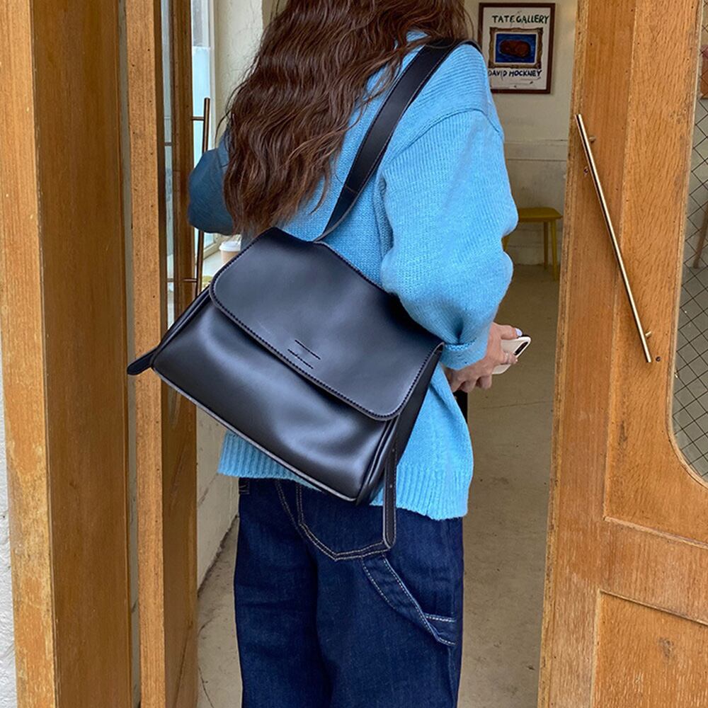 ショルダーバッグ レディース フェイクレザー フリップバッグ 斜めがけバッグ 通学 2way肩掛けバッグ 通勤 韓国風ショルダーバッグ黒 スクエアバック レトロバッグ 無地シボ感と膨らみのある上質な合皮を使用したショルダーバッグかぶせ蓋の部分は一枚でたっぷりと使ったデザインが秀逸。