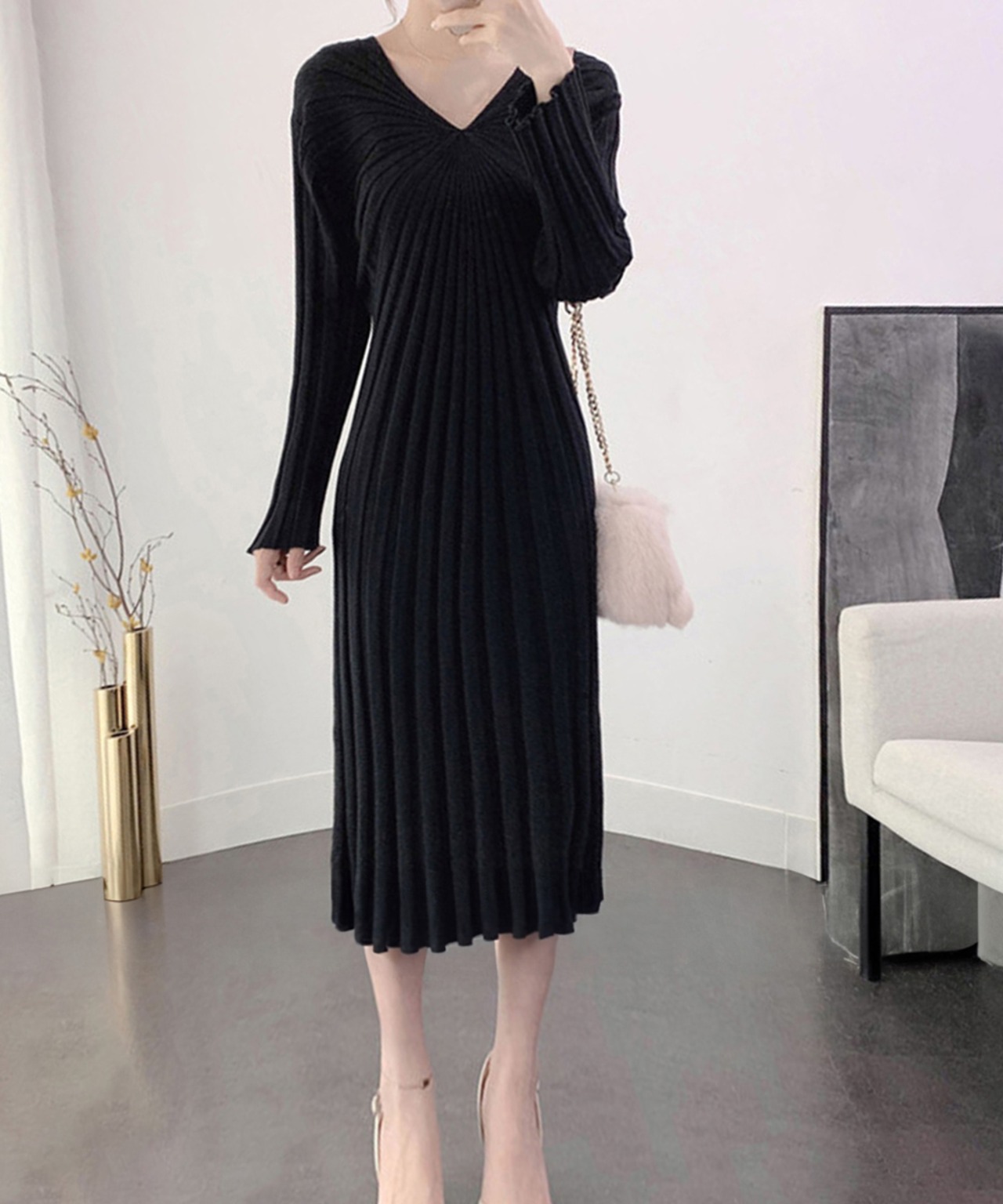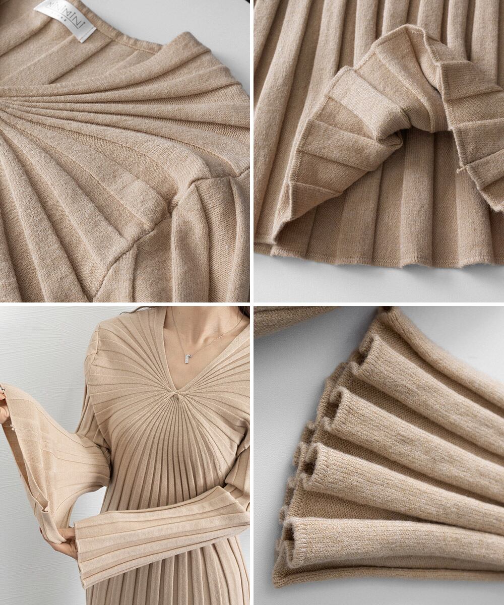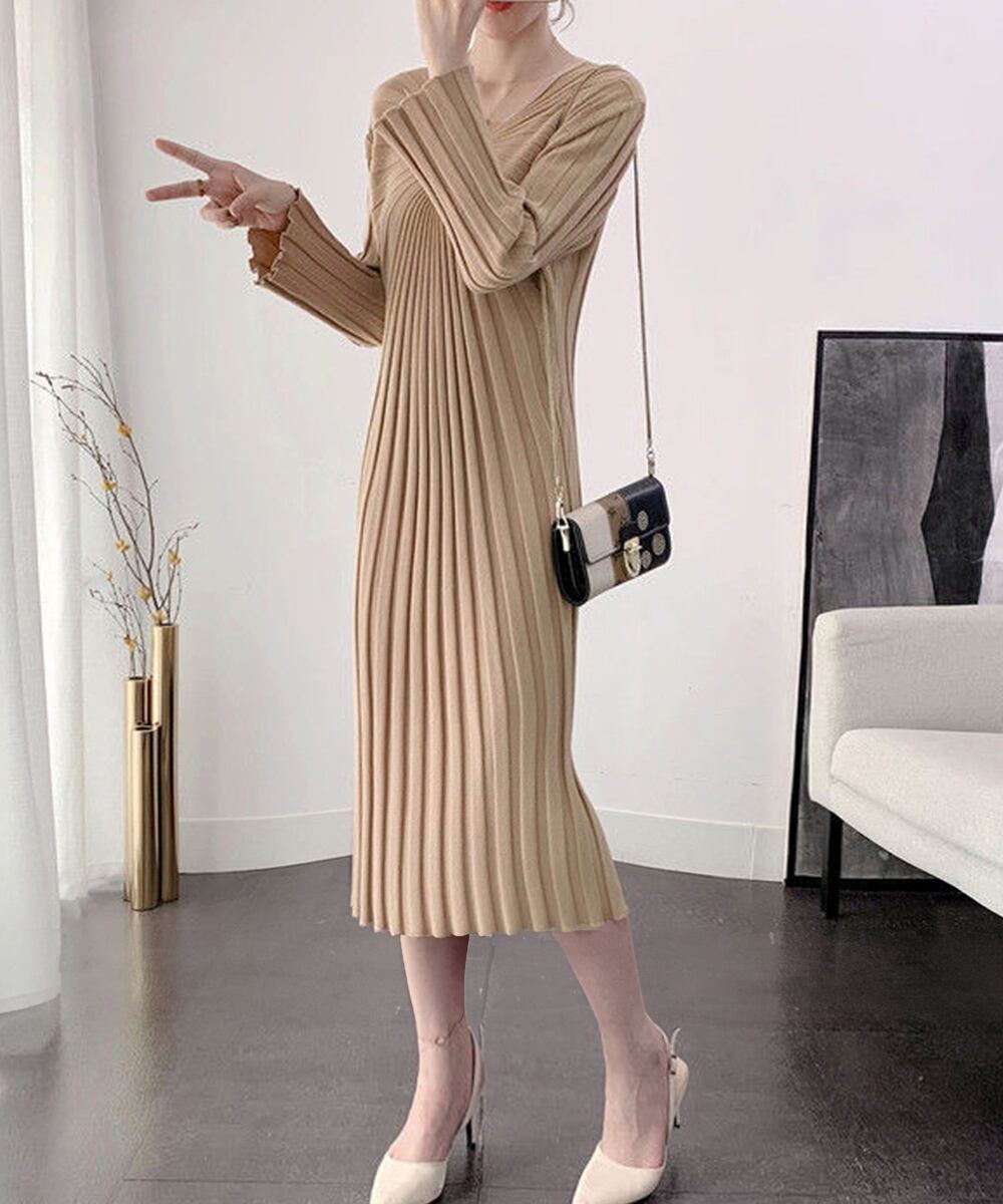Vネック ワンピース レディース ニットワンピース 秋冬 長袖リブニット ミモレワンピ 膝丈下 フェミニン きれいめ伸縮性 着やせ効果 ハイウエスト ニットワンピース黒オンオフ問わず活躍する優秀なニットワンピースVネックラインがすっきりとした顔まわり、美デコルテ見せをかなうポイントアウターを羽織ってももたつかないスッキリとした細身のシルエット、1枚でもボディラインをキレイに見せてくれます素材:ポリエステル75%+アクリル25%カラー:ベージュ/ブラック/アイボリー/ピンク/グリーンサイズ:ワンサイズ総丈:約98cm 肩幅:約40cm 袖丈:約54cm ゆき:約74cm 身幅:約49cm 胸囲:約98-120cm ウエスト:約90cm ヒップ:約100cm裏地:なし伸縮性:あり透け感:淡色のみ若干あり生産国:中国※すべて平置きサイズです(採寸方法違いより、多少の誤差がございますので、ご了承ください)。