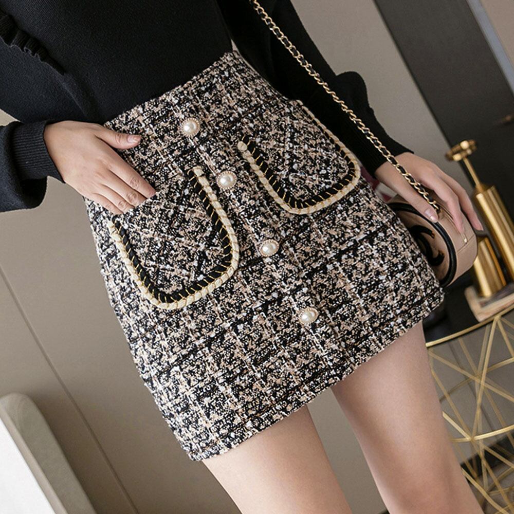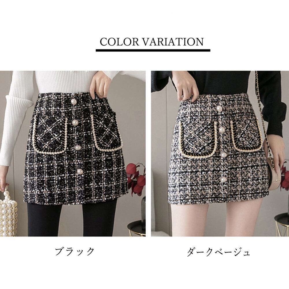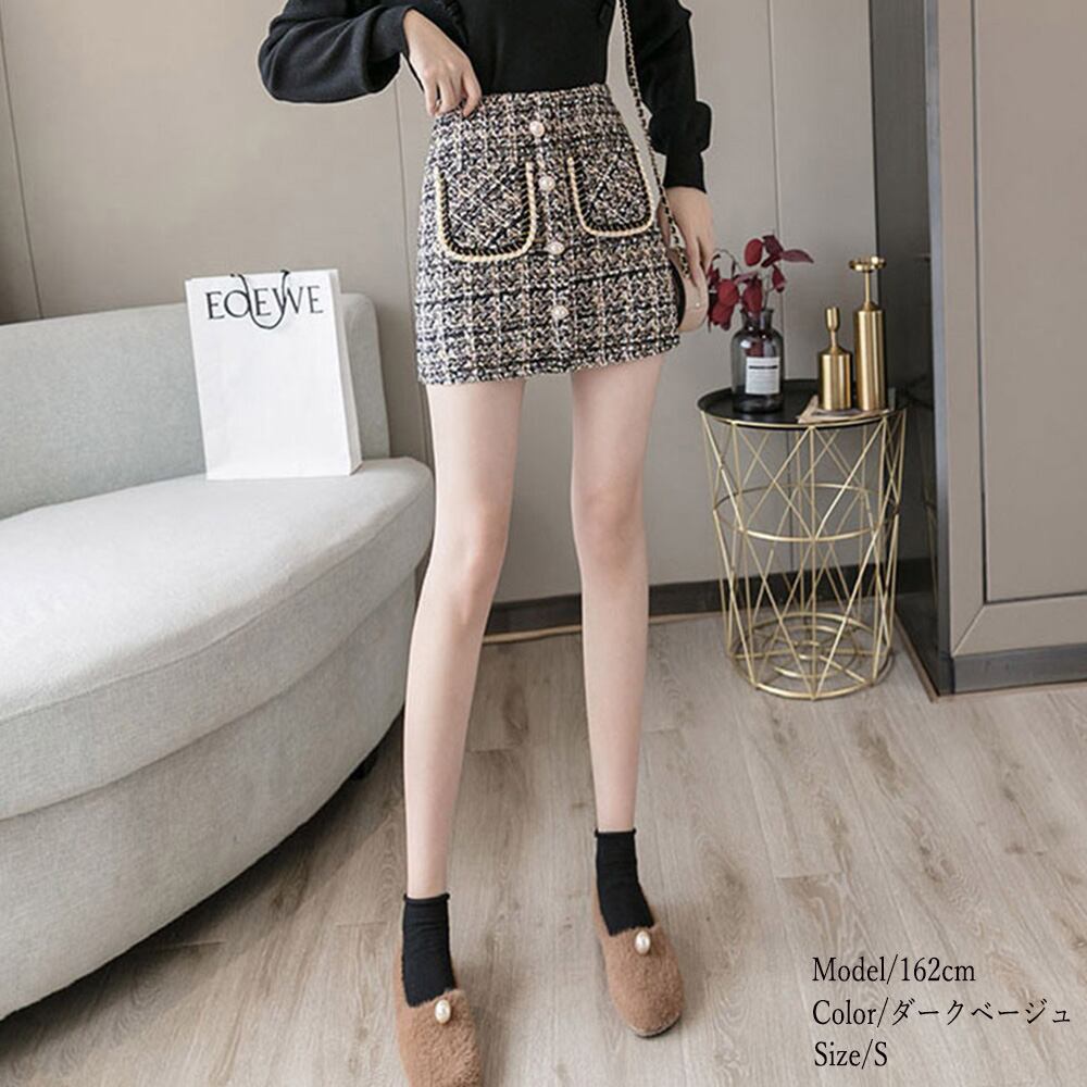 チェック柄スカート レディース ハイウエスト台形スカート 着やせ お洒落 厚手膝上スカート 美脚 韓国 春秋冬大人可愛いショート丈スカート チラ見え防止ボトム きれいめセクシー服スタイルがよく見える台形シルエットなツイード風ミニスカートしっかりとした厚みのある生地と、インナーパンツ仕様でミニ丈でも安心おしゃれしながら秋冬に嬉しい防寒効果も抜群、オフィススタイルまで幅広いシーンで活躍素材:綿65%+ポリエステル35%カラー:ブラック/ダークベージュサイズ:S/M/L/XL[S]スカート丈:約39cm ウエスト:約64cm ヒップ:約80cm[M]スカート丈:約39cm ウエスト:約68cm ヒップ:約84cm[L]スカート丈:約40cm ウエスト:約72cm ヒップ:約88cm[XL]スカート丈:約40cm ウエスト:約76cm ヒップ:約92cm裏地:あり伸縮性:なし透け感:なし生産国:中国※すべて平置きサイズです(採寸方法違いより、多少の誤差がございますので、ご了承ください)。