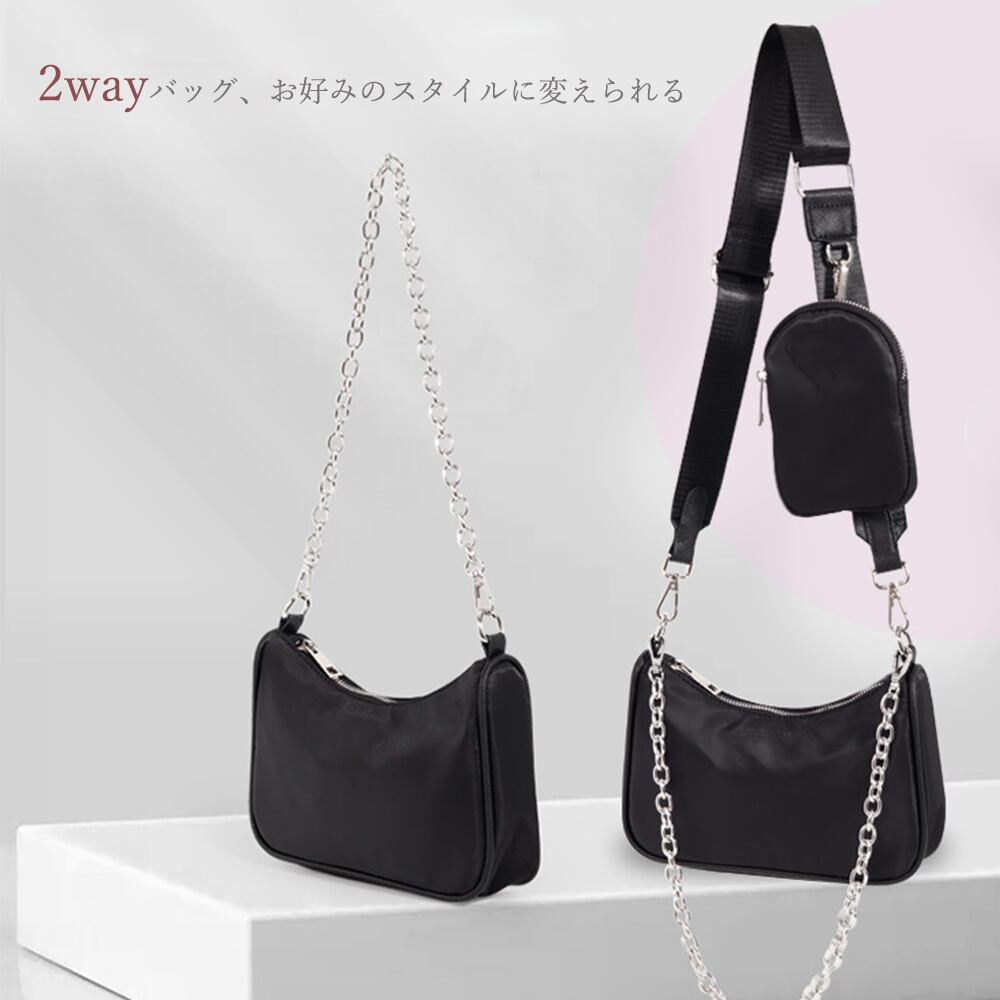 2wayチェーンバッグレディース 小さめ 斜め掛けバッグ 小銭入れ付き ウエストバッグ おしゃれ肩掛け鞄 カジュアル軽量シンプル大人かばん ストリート鞄 人気 ボディバッグレトロレトロ感が溢れる小銭入れ付きミニショルダーバッグです付属の小銭入れ、ショルダーとチェーンはそれぞれ取り外し可能なので、その日の気分で形を変えて使っていただけますポーチも付いており、化粧品、ケータイのバッテリ充電などの収納にもなります素材:ポリエステル100%カラー:ブラックサイズ:ショルダーバッグ高さ:約14cm 底横幅:約22cm マチ:約5.5cm チェーンショルダー:約43cm(取り外し可、長さ調整不可) ナイロンショルダー:約80-122cm(取り外し可、長さ調整可)小銭入れバッグ(取り外し可)高さ:約11.5cm 底横幅:約9cm マチ:約1.5cm重さ:約344g裏地:あり内ポケット:あり生産国:中国※すべて平置きサイズです(採寸方法違いより、多少の誤差がございますので、ご了承ください)。