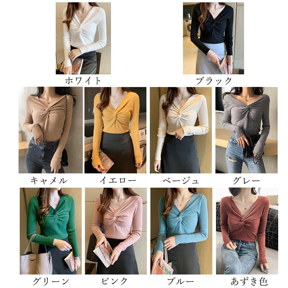 ひねり Vネックニットソー ストレッチプルオーバー 長袖ニットセーター薄手 春秋冬インナートップス 細見えシンプルニットタイトニット着やせ ニットソー ねじり トップス きれいめ胸元のひねりデザインが特徴的でとっても洒落なニットトップスです体にぴったりにフィットし、体のラインを綺麗に魅せてくれますパンツにもスカートにも合わせやすく華やかなシーンにもぴったりなアイテムです素材:ポリエステル75%+アクリル25%カラー:ブラック/ホワイト/ベージュ/グレー/ブルー/キャメル/ピンク/イエロー/あずき色/グリーンサイズ:ワンサイズ着丈:約51cm 肩幅:約29cm 袖丈:約48cm ゆき:約62.5cm 身幅:約30cm 胸囲:約60-100cm裏地:なし伸縮性:あり透け感:淡色のみややあり生産国:中国※すべて平置きサイズです(採寸方法違いより、多少の誤差がございますので、ご了承ください)。