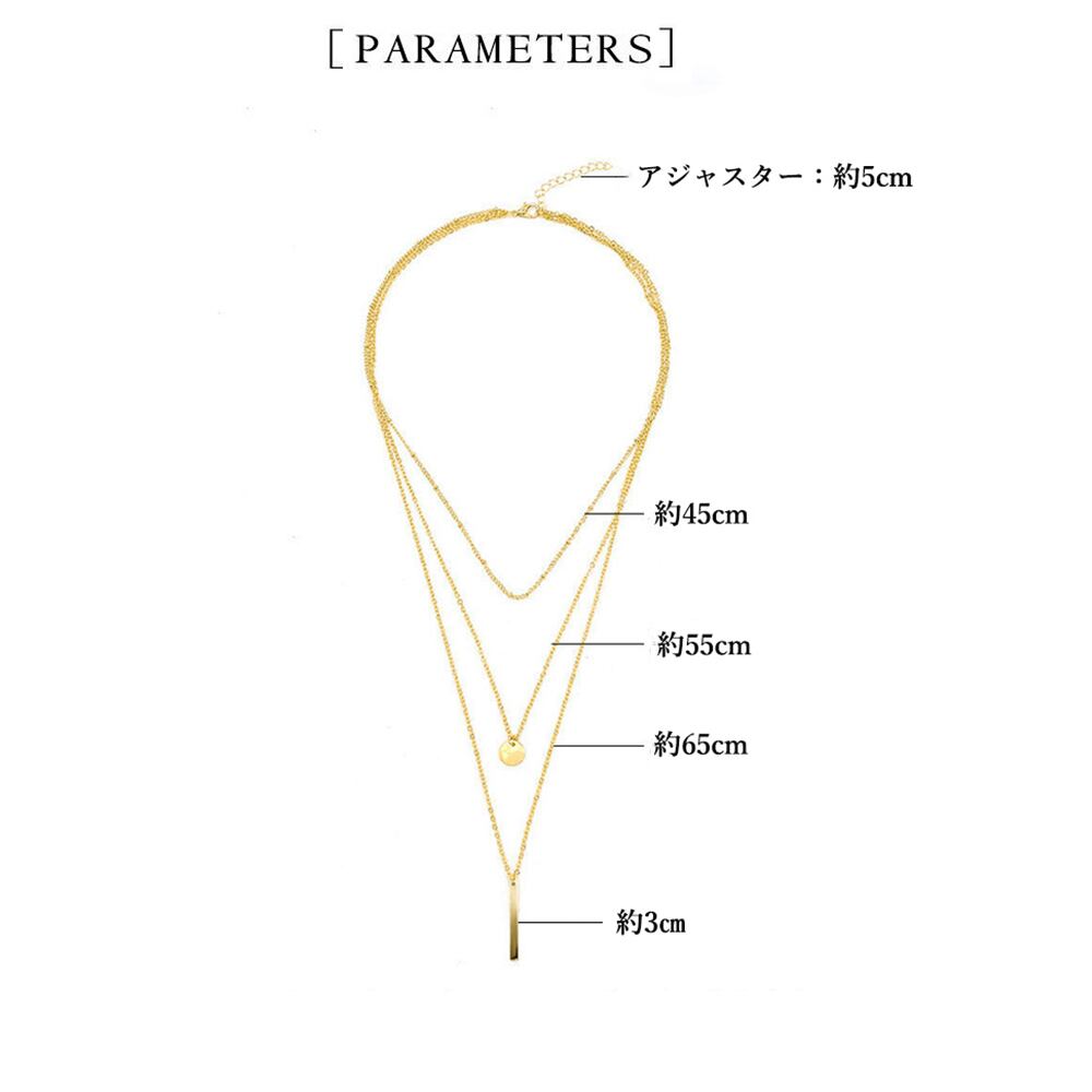 華奢なゴールドのチェーンが女性らしい繊細なデザインの3連チェーンネックレス首元から胸元まで美しくみせてくれる、それぞれ長さが異なる3連チェーンにトレンド感、派手すぎない程よいがこなれ見えシンプルスタイルに映えるスタイリッシュさが、カジュアルからキレイめまで幅広くマッチカラー:ゴールド/シルバー素材:合金襟周り:約45/55/65cmアジャスター:約5cmチャームの長:約3cm生産国:中国※包装に関しての注意点:こちらの商品は激 安で販売しているため、化粧箱は付いていませんが、商品に傷付かないよう簡易包装で発送とさせていただきます。