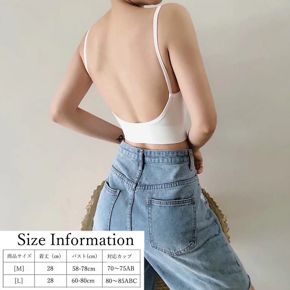 自然なバストを美しく演出するノンワイヤーパッド入りキャミソール背中は大胆に開いてお肌をセクシー魅せ、そのまま着てはもちろん、バックシャントップスに響かないのでインナーとして着てもOK肌触りの良いリブ生地を使用、さらっと着られる軽やかな着心地、お家でのリラックスタイムにもおススメの1枚カラー:ブラック/ホワイト/モカベージュ/肌色/グリーン/ブラウン/ダースティピンク/テラコッタ素材:ナイロン88%+スパンデックス12%サイズ:M/L[M]70〜75AB 着丈:約28cm バスト:約58-78cm[L]80〜85ABC 着丈:約28cm バスト:約60-80cm補正機能:なしワイヤー:なしカップ:ありパッド取り外し可裏地:なし伸縮性:あり透け感:なし生産国:中国※すべて平置きサイズです(採寸方法違いより、多少の誤差がございますので、ご了承ください)。