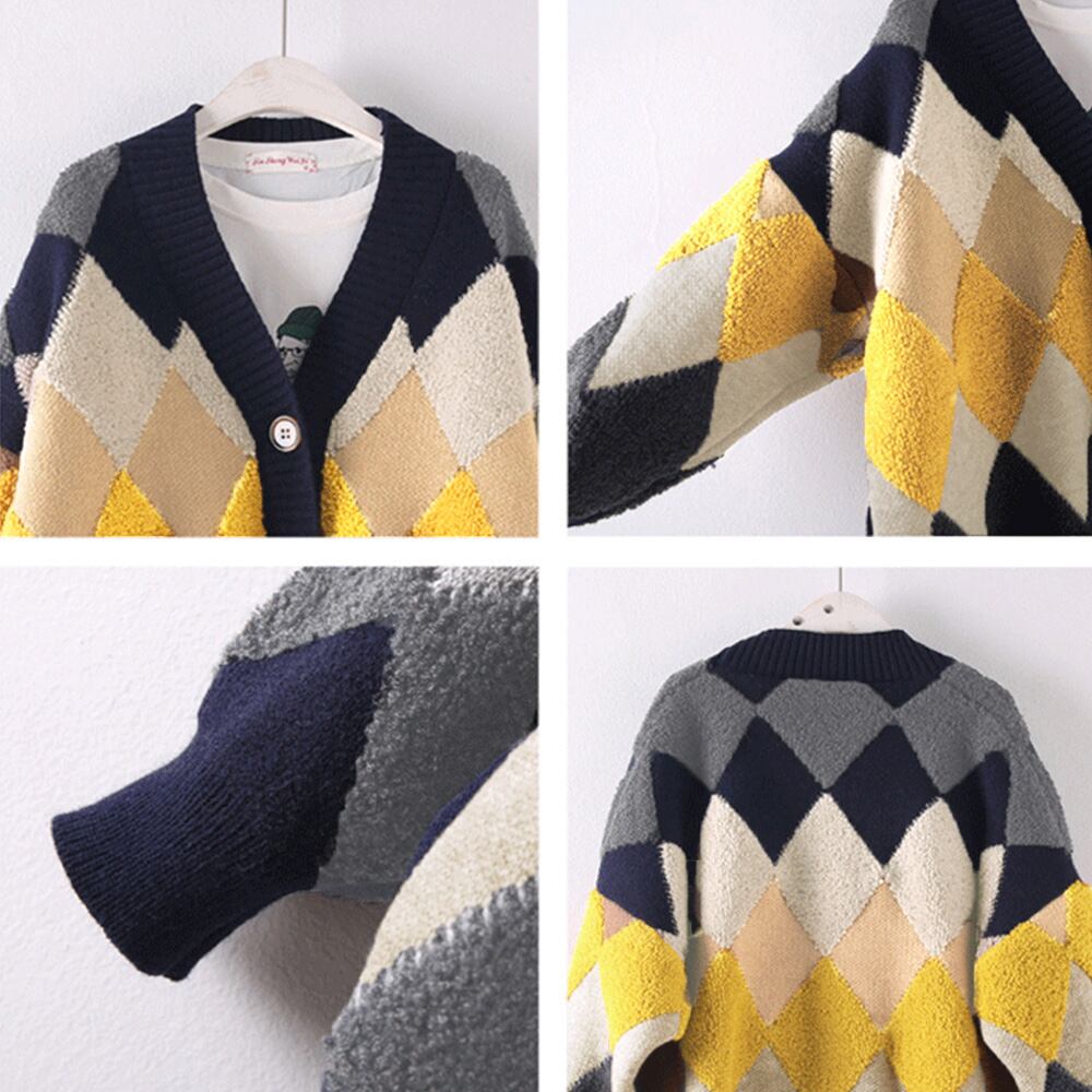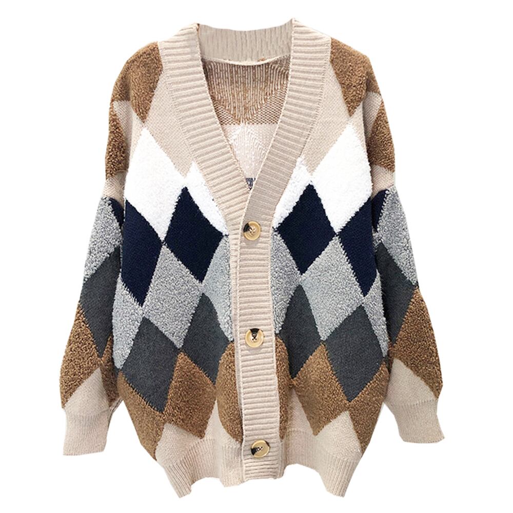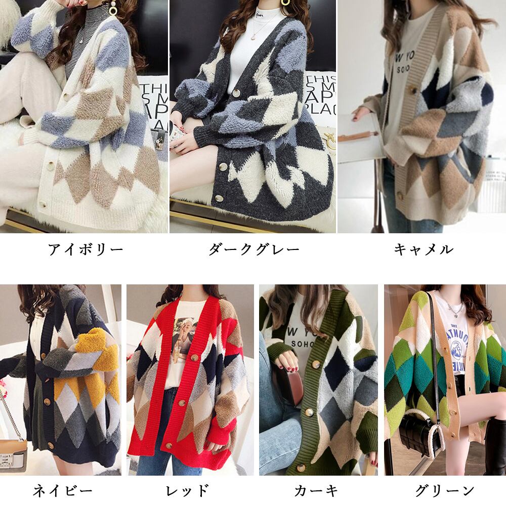 アーガイル柄 ニットアウター vネック 中厚手 長袖ニットソー 体型カバー羽織 お洒落カーデ カジュアル 女子ニットチェック アウター 秋冬上着ジャンパー 大人ニットトップス明るい配色のひし形チェック柄が浮き出るもこもこボアでアクセントになるカーディガン暗くなりがちな秋冬では存在感抜群ながらも、季節に馴染みやすい色合いなので派手過ぎず着こなしやすいトップスシンプルなボトムスを合わせてコーデ達人に即変身できる主役級アイテム、少しメンズライクなゆったり感があって、お友達や恋人とのリンクコーデもおすすめ素材:アクリル100%カラー:キャメル/ネイビー/アイボリー/ダークグレー/カーキ/グリーン/レッドサイズ:ワンサイズ着丈:約70cm 肩幅:約68cm 袖丈:約41cm ゆき:約75cm 身幅:約62cm 胸囲:約124-160cm裏地:なし伸縮性:あり透け感:なし生産国:中国※すべて平置きサイズです(採寸方法違いより、多少の誤差がございますので、ご了承ください)。