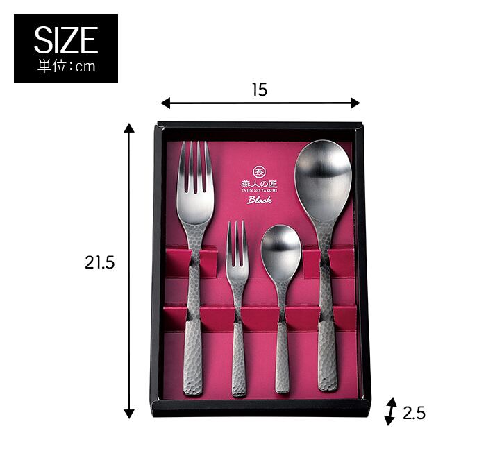 ■セット内容●コーヒースプーン:全長約12cm●ヒメフォーク:全長約12.4cm●デザートスプーン:全長約18cm●デザートフォーク:全長約18.2cm■重量[箱入り]約210g■材質18-0ステンレス鋼(黒色酸化被膜加工)■生産国日本