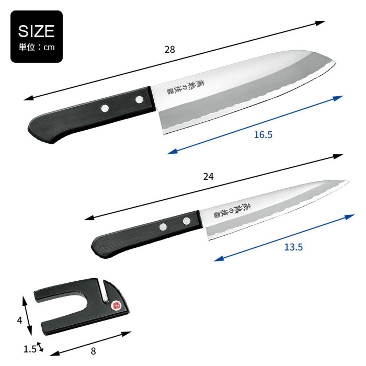 ■セット商品●三徳包丁[全長]約28cm [刃渡り]約16.5cm●ペティナイフ[全長]約24cm [刃渡り]約13.5cm●ミニ砥ぎ器8×1.5×4cm■重量●三徳包丁:110g●ペティナイフ:50g●ミニ砥ぎ器:20g■材料●包丁、ナイフ[刀身]ステンレス刃物鋼[ハンドル]PBT樹脂●ミニ砥ぎ器[本体]ABS樹脂[砥石]セラミック■生産国日本