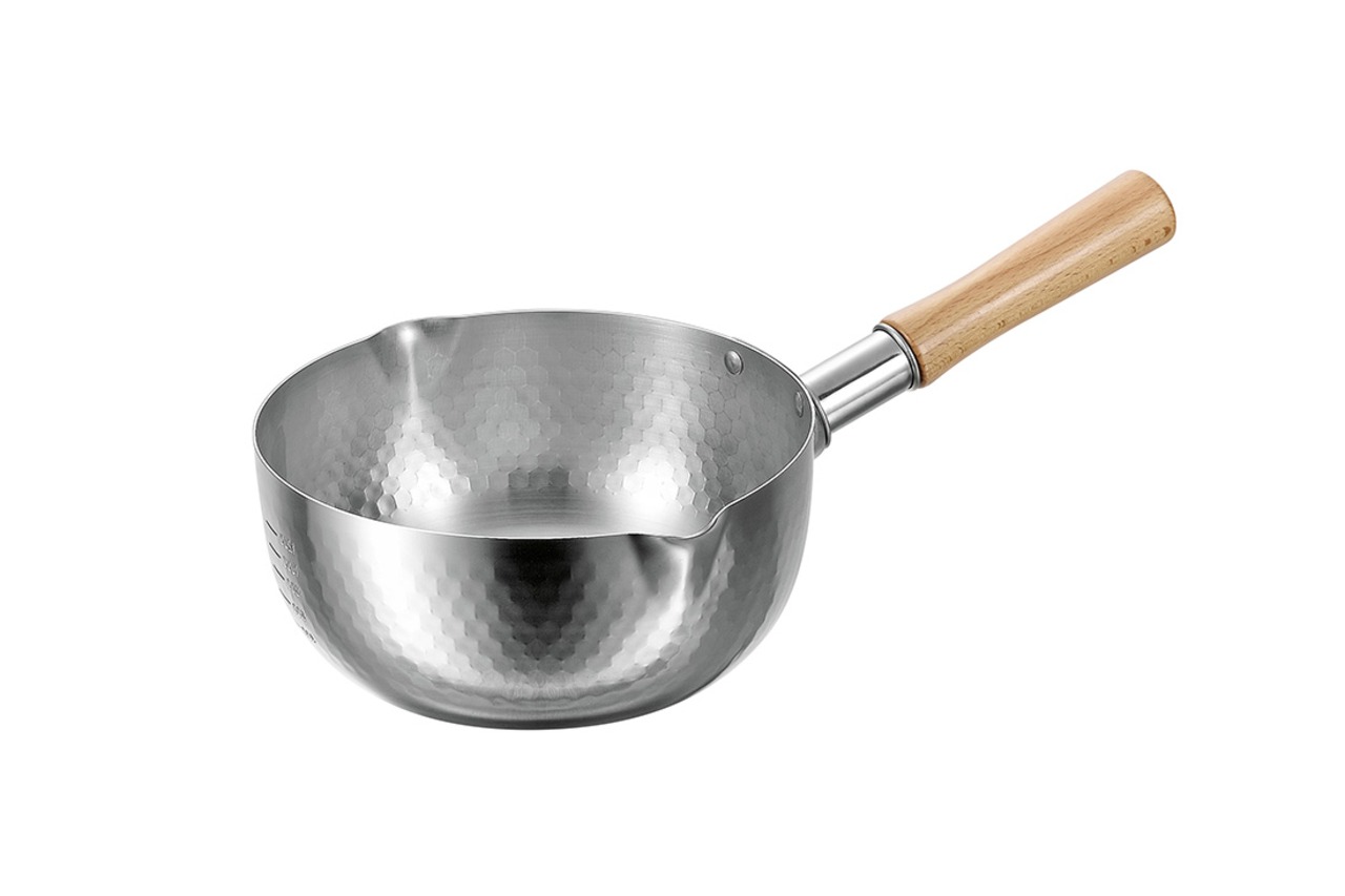 ■製品サイズ約21.8×38×11cm(ハンドル含む)■重量約620g■容量約2.3L■材料[本体]430ステンレス鋼(板厚1.0mm)[持ち手]天然木[持ち手金具]304ステンレス鋼■特徴・機能ガス IH100・200V 電磁調理器OK目盛り付き■IH対応鍋対応可■生産国日本