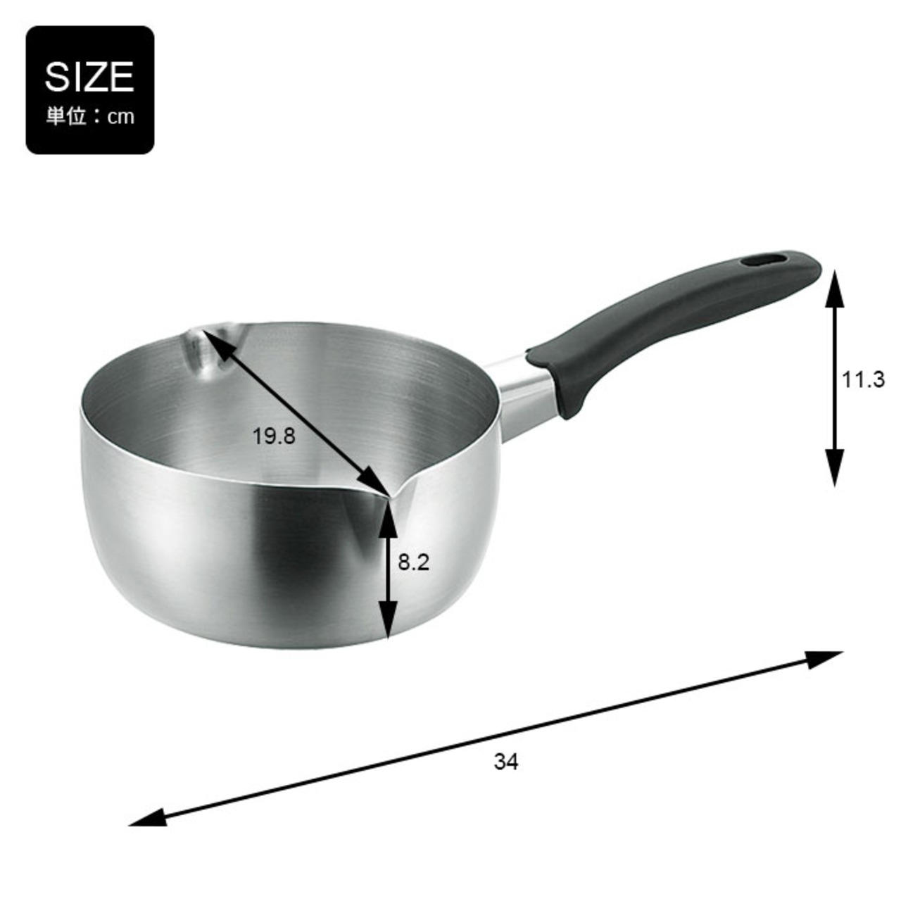 ■製品サイズ約19.8×34×11.3cm(本体高さ:8.2cm)(ハンドル含む)■重量約600g■容量約1.8L■材料[本体]19-0ステンレス(板厚1.2mm)[ハンドル]フェノール樹脂■特徴・機能ガス IH100・200V 電磁調理器OK目盛付■IH対応鍋対応可■生産国日本