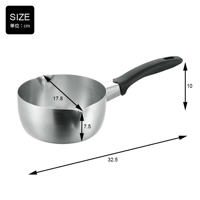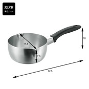 ■製品サイズ約17.8×32.5×10cm(本体高さ:約7.5cm)(ハンドル含む)■重量約470g■容量約1.4L■材料[本体]19-0ステンレス(板厚1.2mm)[ハンドル]フェノール樹脂■特徴・機能ガス IH100・200V 電磁調理器OK目盛付■IH対応鍋対応可■生産国日本