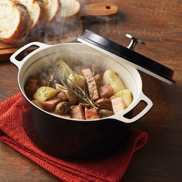 食材の水分でうまみを引き出し、美味しさを逃さない、無水調理ができるセラミック加工両手鍋。