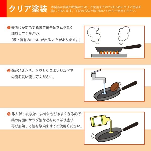 [使用可能熱源]IH 100V・200V(電気調理器)、ガス火、ハロゲンヒーター、ラジエントヒーター、シーズヒーター[クリア塗装]本製品は良質の鉄製の為、ご使用までのサビ止めにクリア塗装を施してあります。