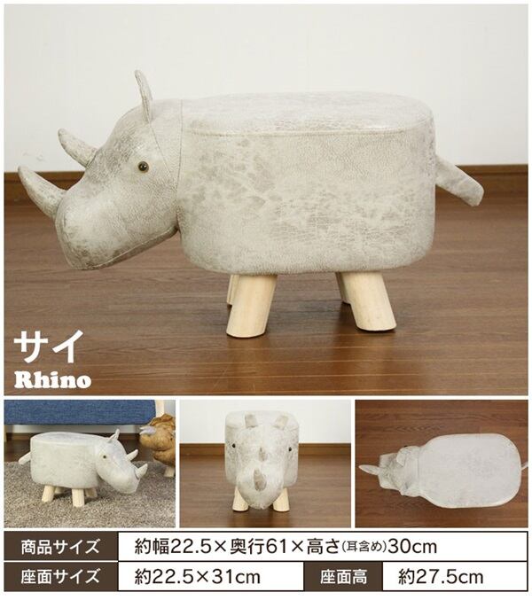 ■サイズ[ゾウ]約幅35cm×奥行67cm×高さ32cm[恐竜]約幅34.5cm×奥行63cm×高さ38cm[イヌ]約幅26cm×奥行50.5cm×高さ26.5cm[サイ]約幅23.5cm×奥行55cm×高さ31.5cm■耐荷重約100kg■材質・素材合成皮革、天然木(パイン材)、スポンジ■生産国中国■組立区分完成品