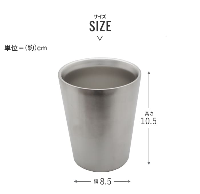 ■サイズ約85×82×105mm■重量 約130g■材質 [[内側]ステンレス鋼(SUS304)※内面加工:電解仕上[外側]ステンレス鋼(SUS201)■内容量約330ml■組立区分完成品
