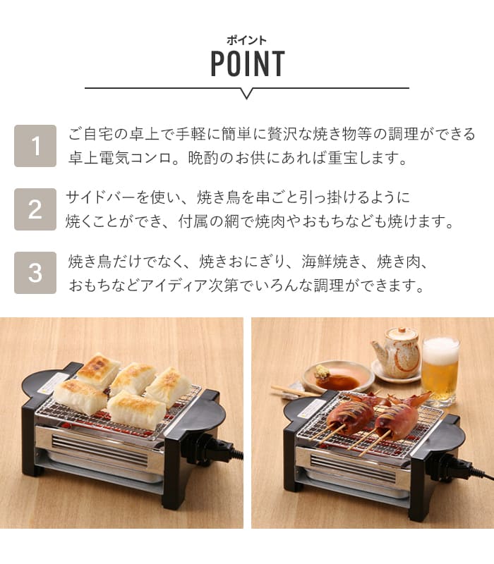 ■サイズ[本体]約幅27.5×奥行15×高さ10cm[焼き網]約幅17.2×奥行16×高さ3cm[汁受けトレー]約幅16.7×奥行13.4×高さ1.8cm[サイドバー]約幅15.5×奥行11.5×高さ2cm■重量約960g■素材・材質[本体]フェノール樹脂、アルスター[焼き網]鉄、クロームメッキ[汁受けトレー]アルスター[サイドバー]鉄、クロームメッキ■消費電力650W■電源100V 50・60Hz■温度ヒューズなし■コード長約1.6m(マグネット式)■原産国中国■同シリーズ● 卓上焼き鳥コンロ やきやき● 電気保温おでん鍋※このページは「卓上焼き鳥コンロ やきやき」を販売しております。