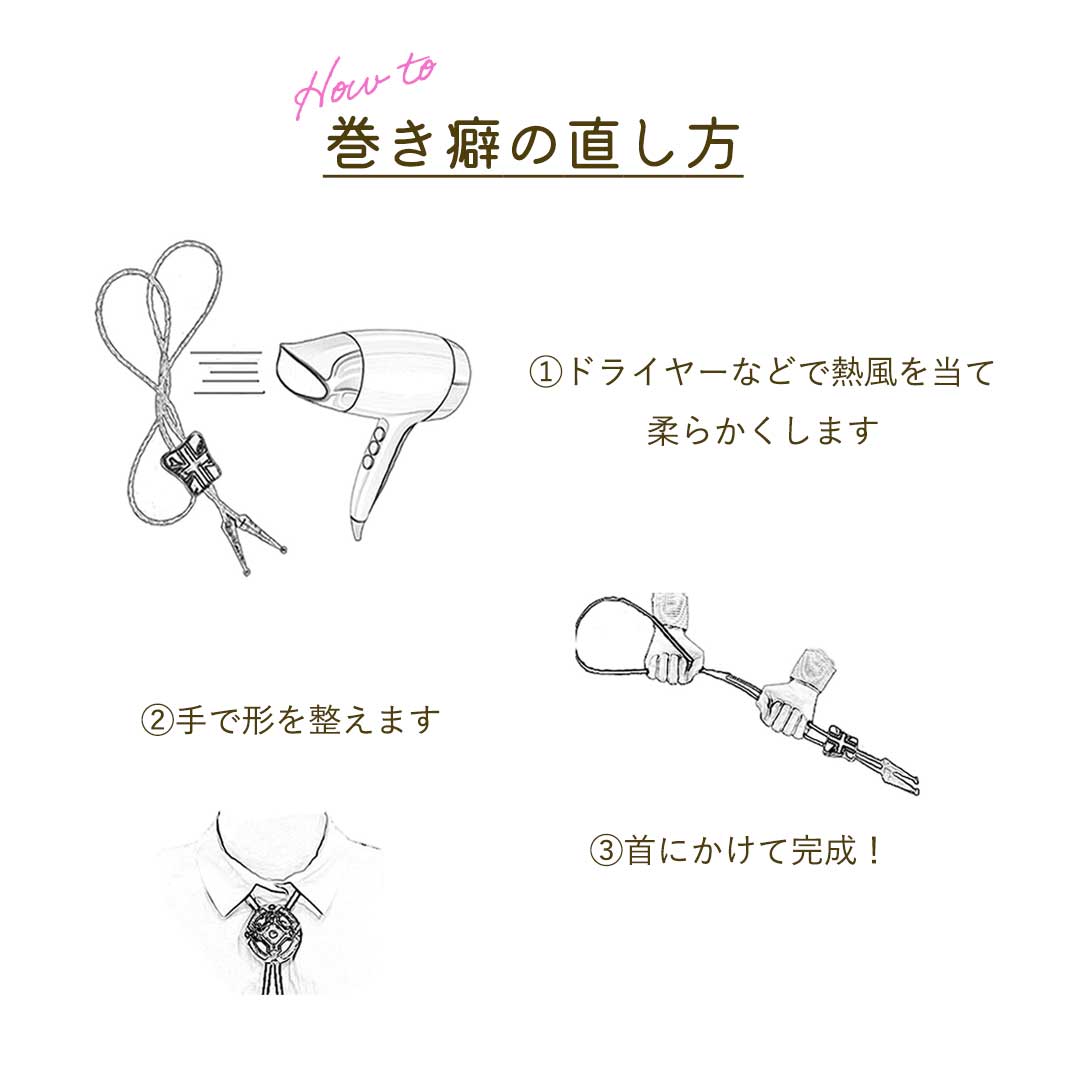 留め具で長さを調節できるのが特徴で、好みによって長さを縮めたり広めたりと工夫することができるため、余らせる長さによって個性を出すことも可能です。